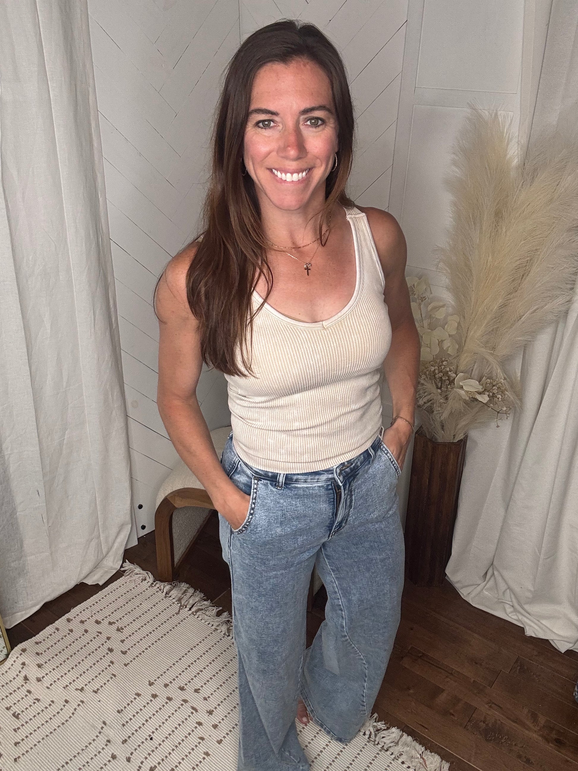 COMFY!! Perfect basic tank for wearing solo or pairing it with your favorite cardigan, blazer, or jean jacket!! Removable Bra Pads.