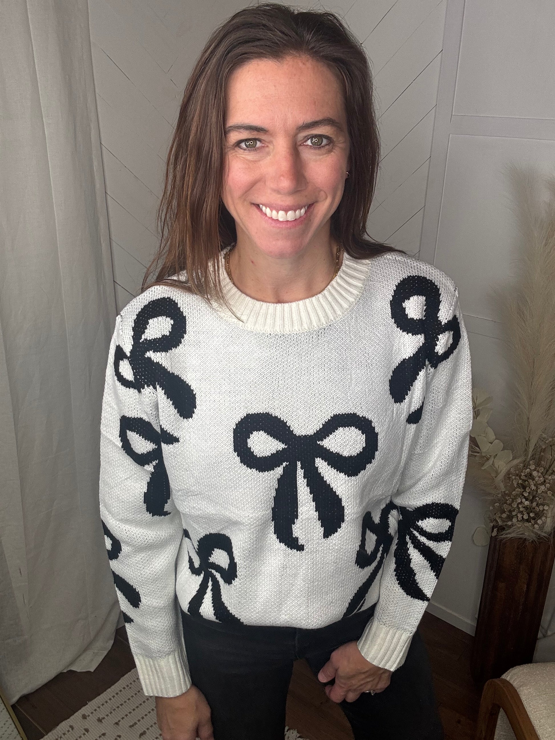 A timeless blend of charm and comfort! This cream knit sweater features an elegant black bow design on both the front and back, adding a chic touch from every angle. Crafted from 100% acrylic for a soft, cozy feel you’ll love all season long.