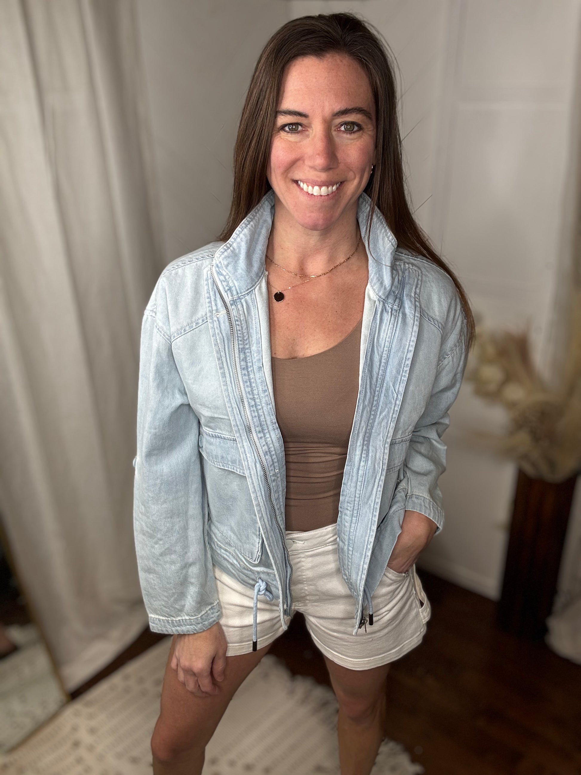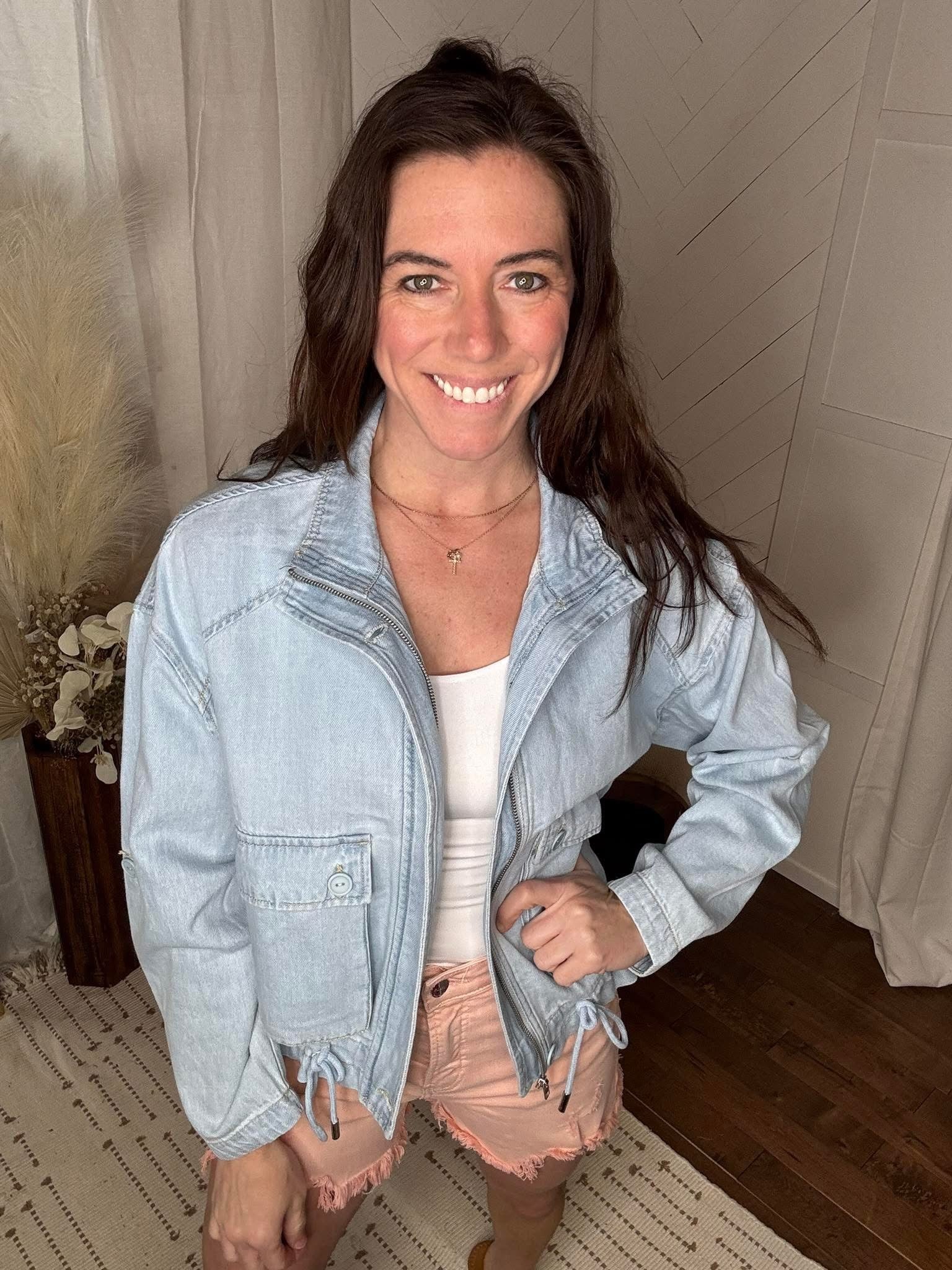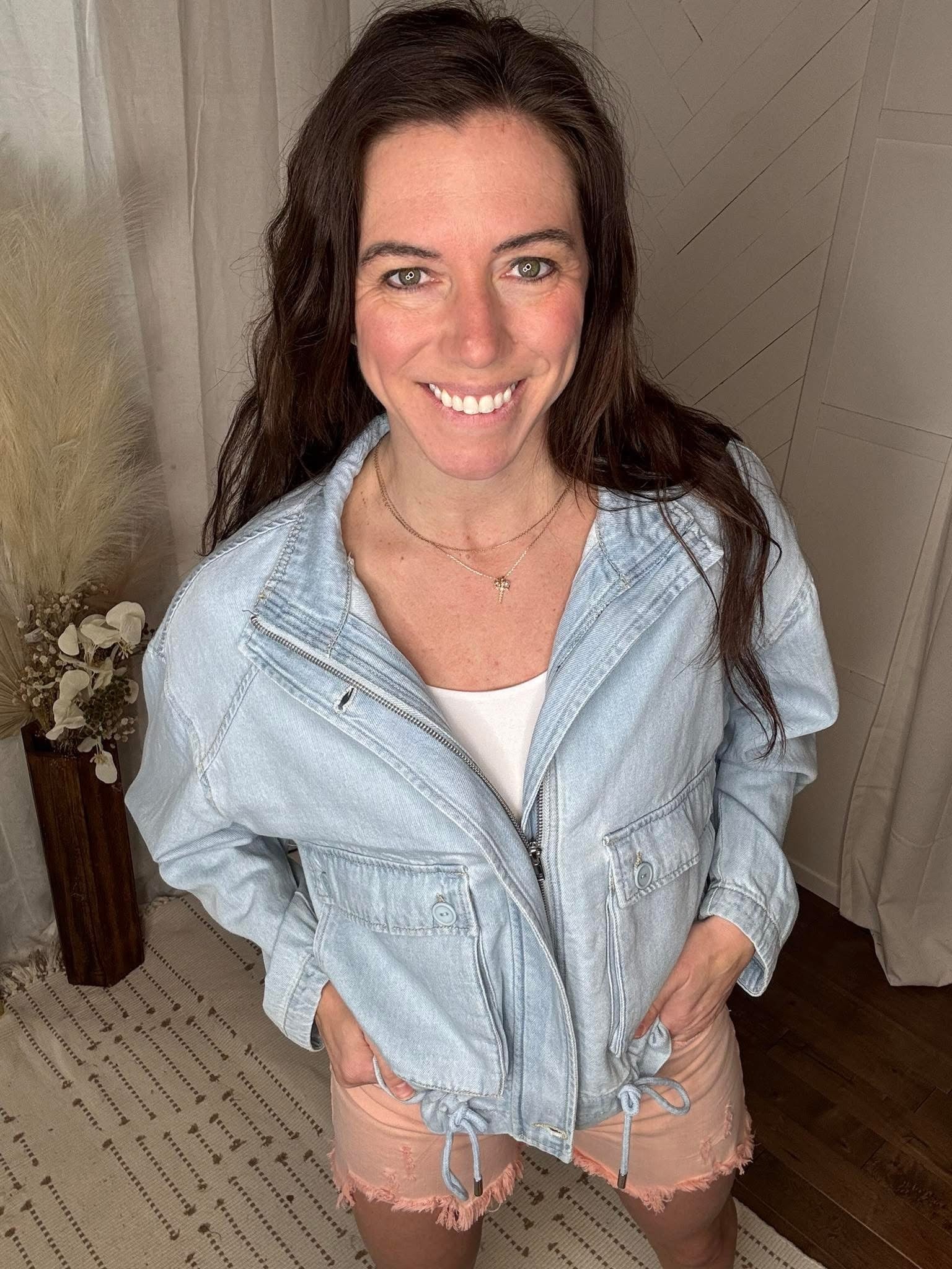 Obsessed with the color, cargo pockets, adjustable waist and comfort of this denim jacket!!