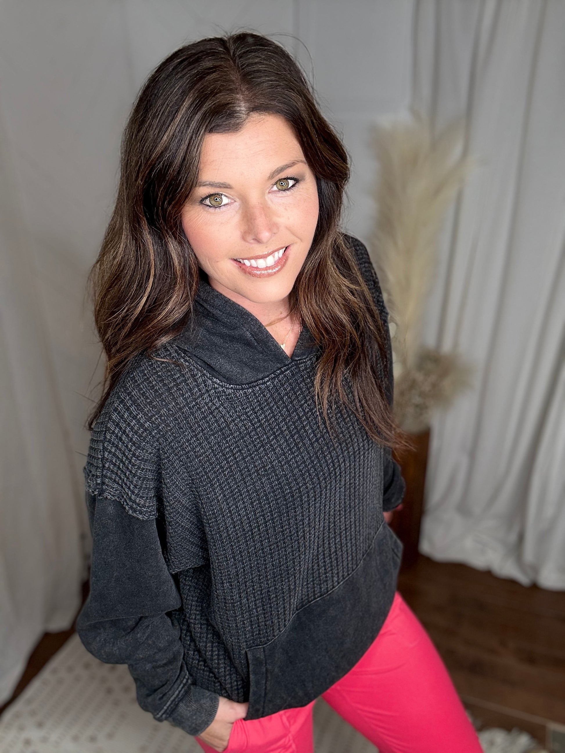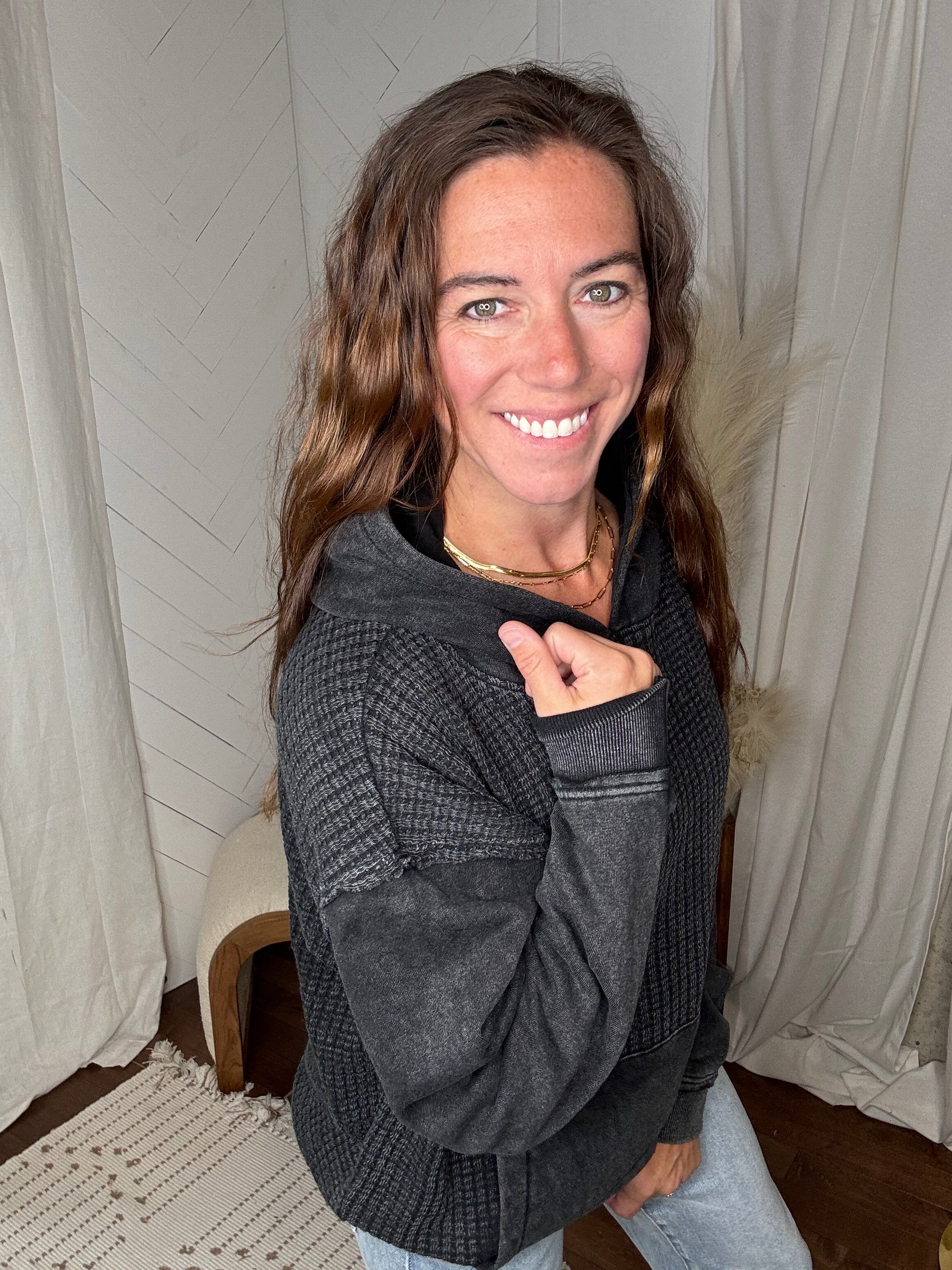 Waffle Knit Hoodie: Black