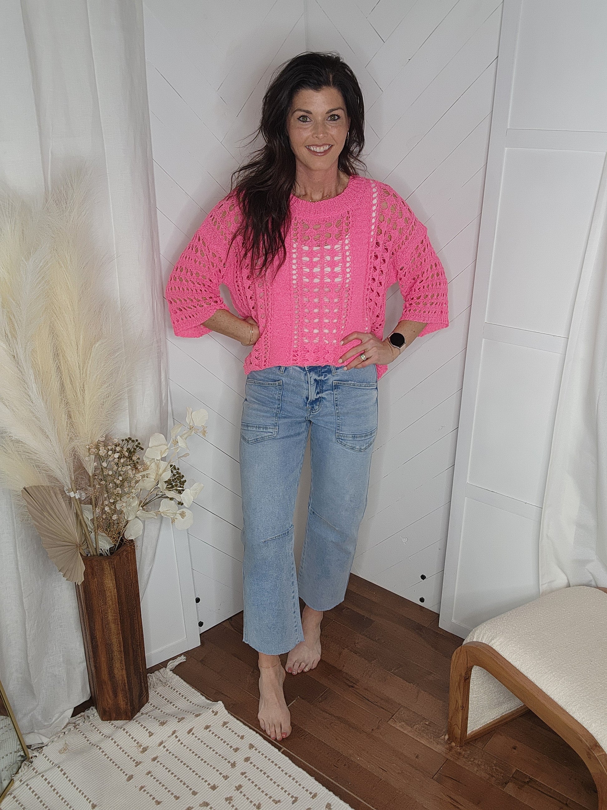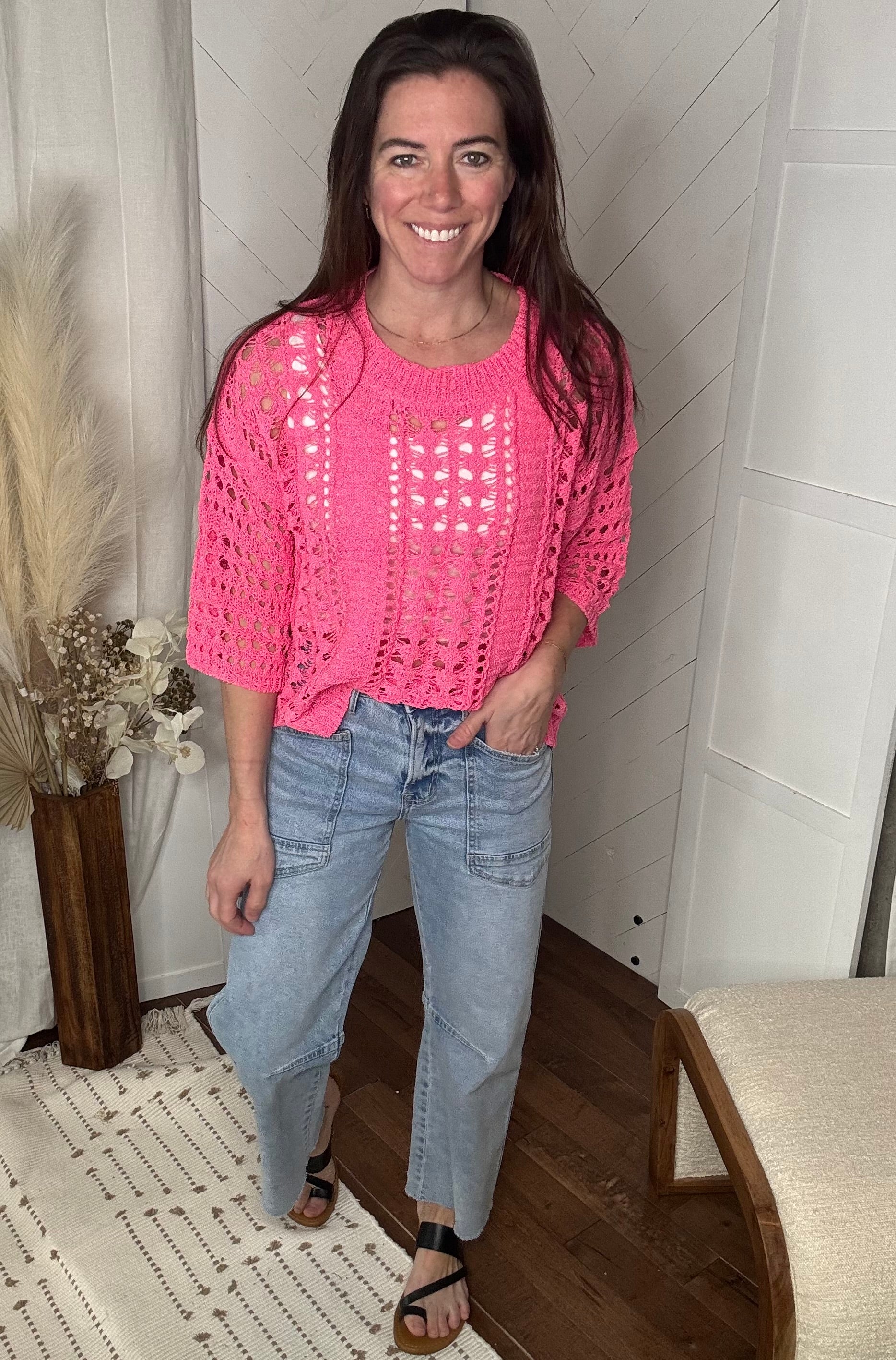 Lightweight knit and breezy detailing. Gorgeous fuchsia color for warmer days ahead.