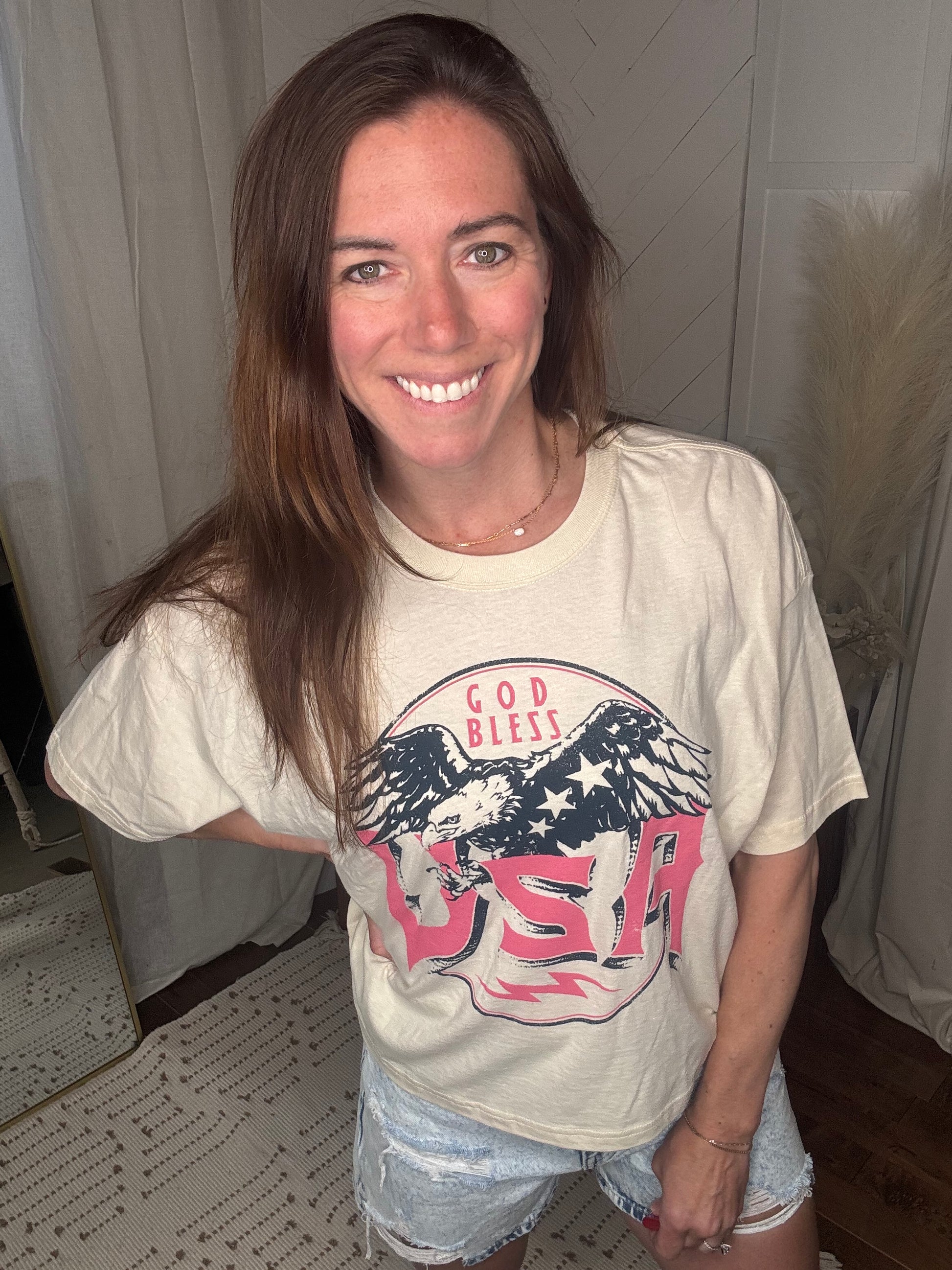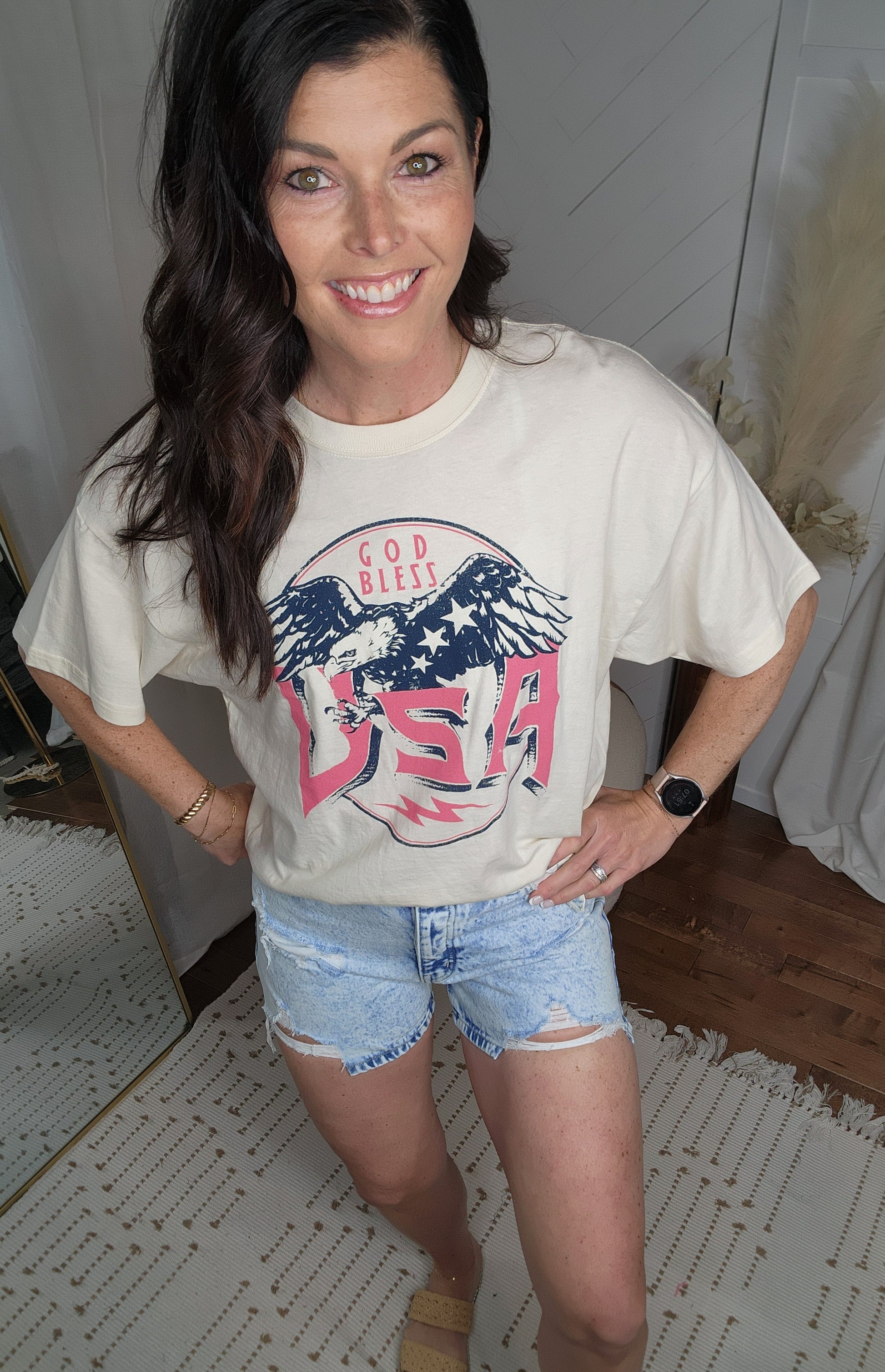 Vintage white, Must-have short sleeve crop graphic tee – the perfect addition to your boutique. Loose fit, stylish, soft, comfortable, crew neck crop shirt.