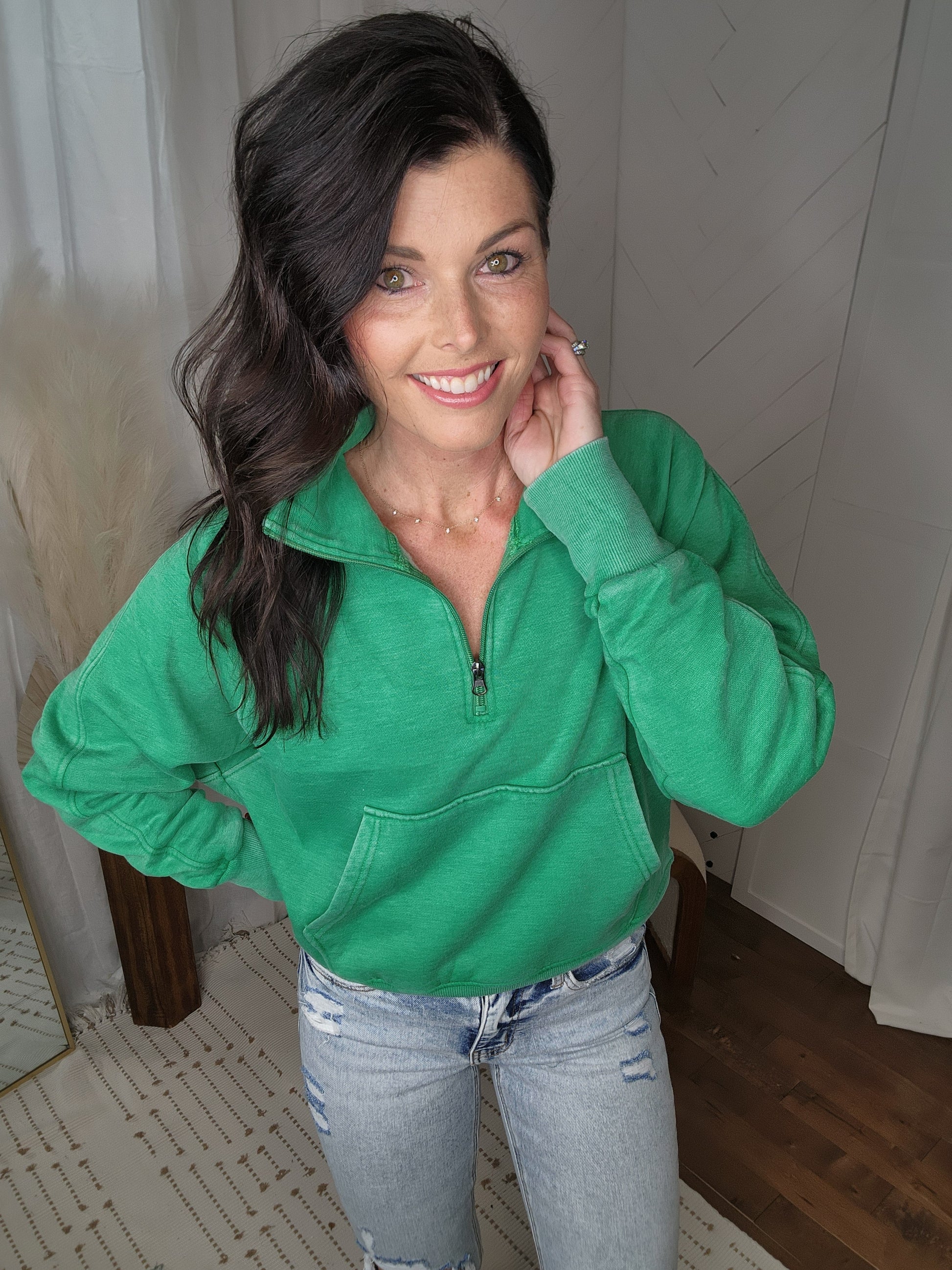 Green cropped funnel neck sweatshirt with a quarter zipper closure on the front. Beautiful mineral washed green color!