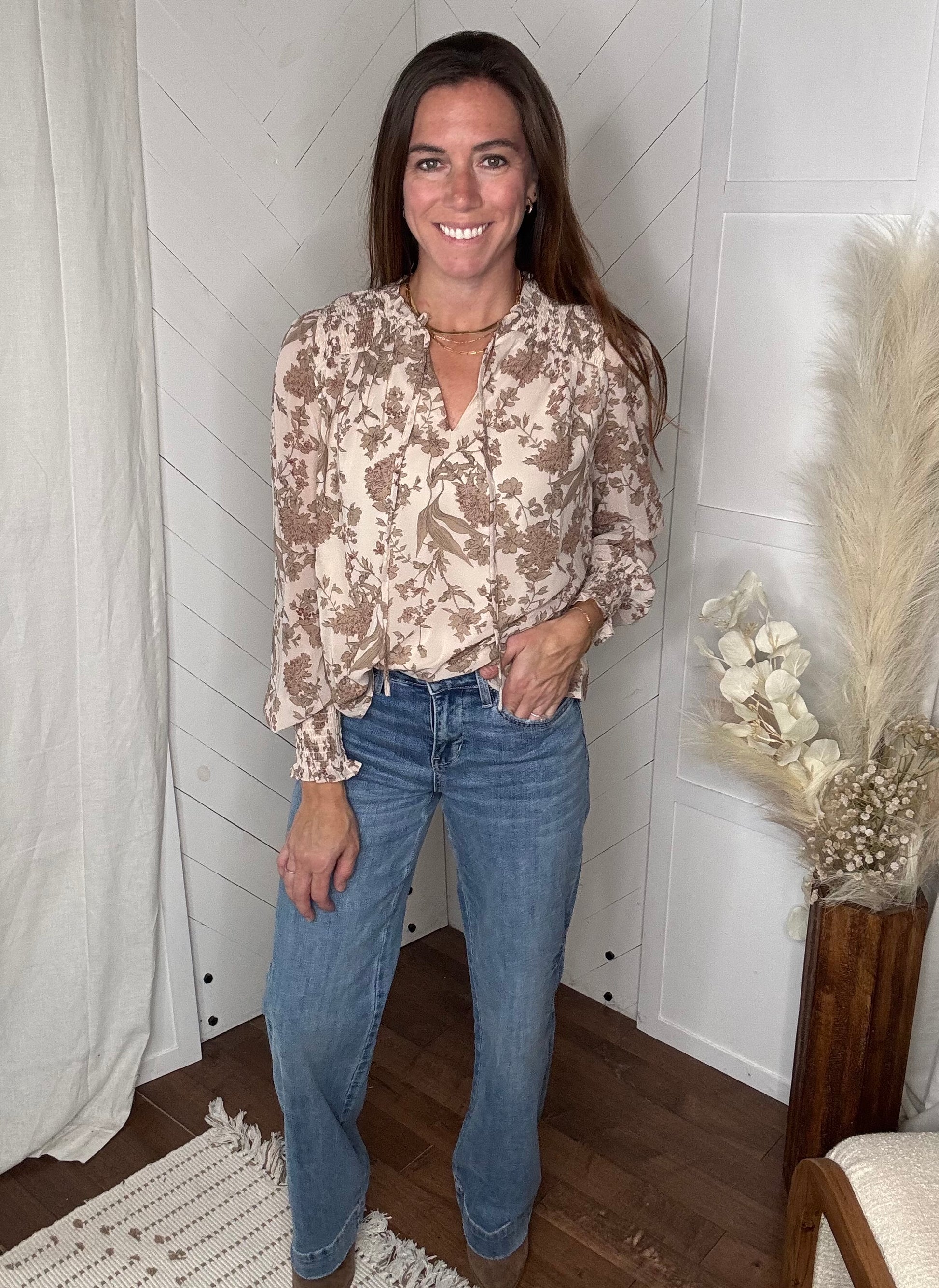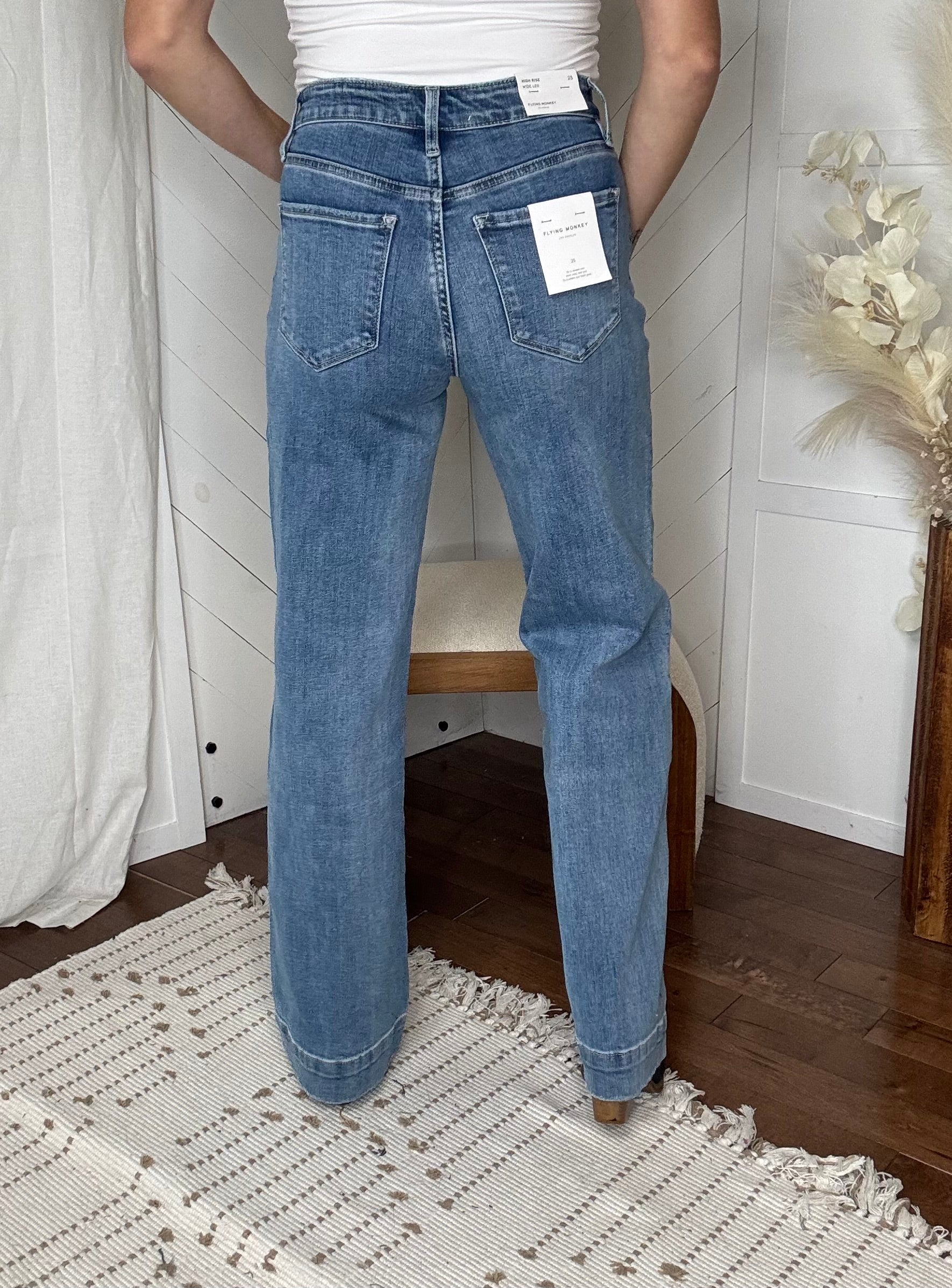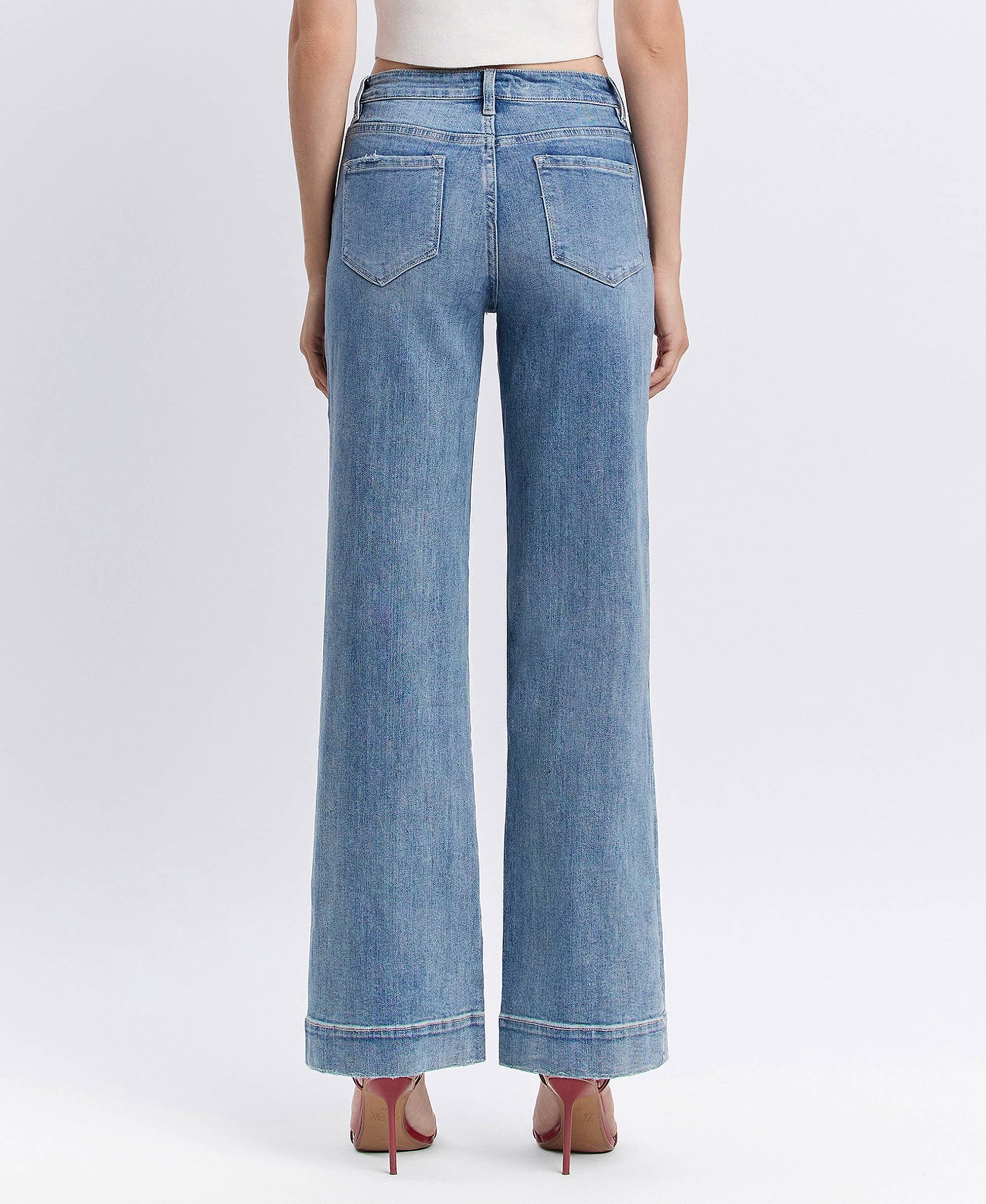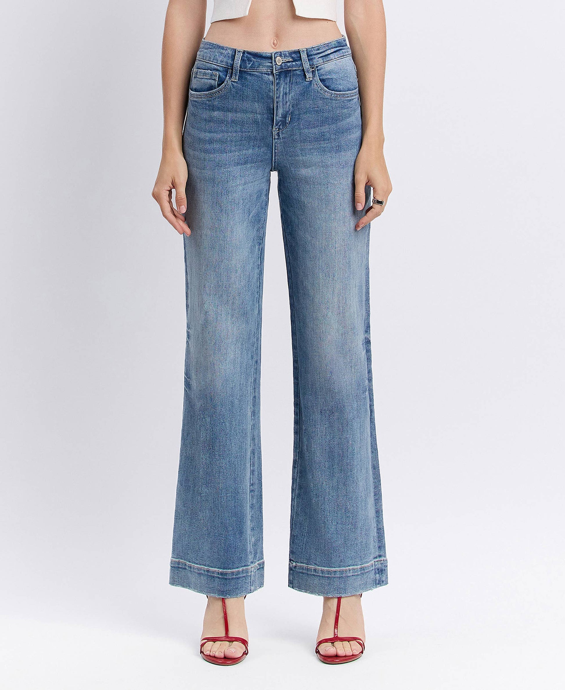 Comfort stretch denim with a high rise waist, a stitched trouser hem, and extra detailing on the side.