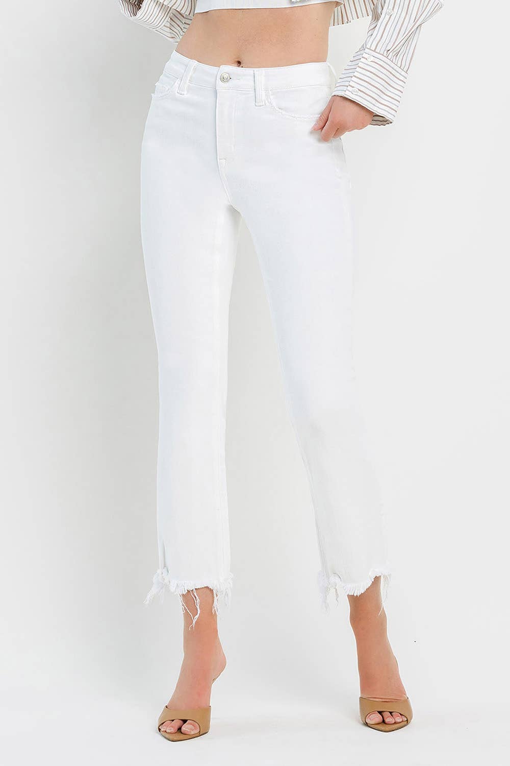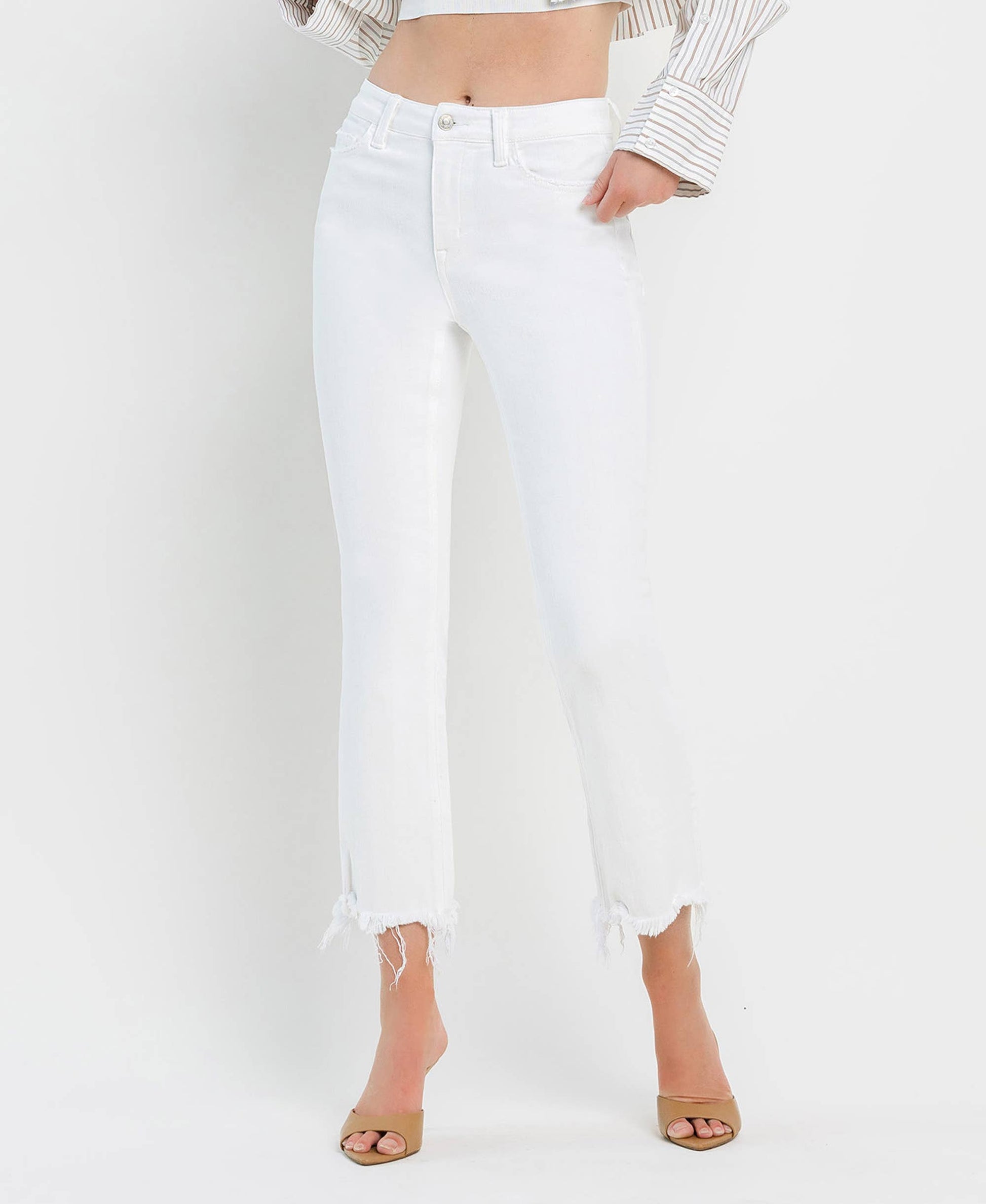 High rise, Crop flare, uneven raw hem, and pure white. COMFORT STRETCH DENIM