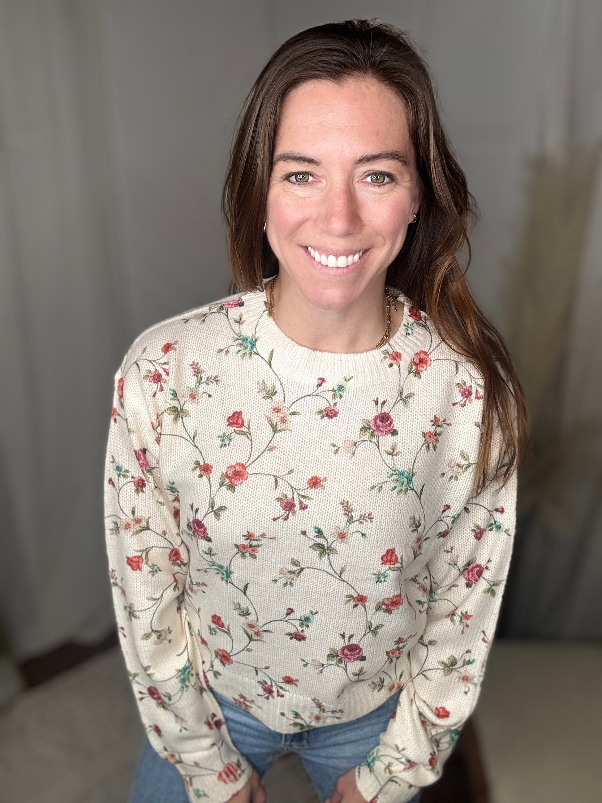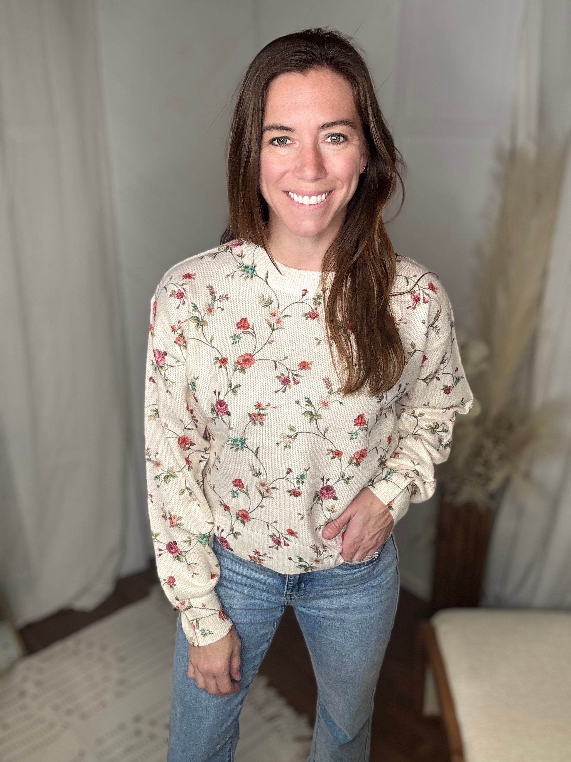 This ivory knit sweater features a delicate floral print and a textured finish that adds dimension and charm. Effortlessly stylish for any season, it pairs beautifully with jeans or a skirt for a feminine, comfortable look.