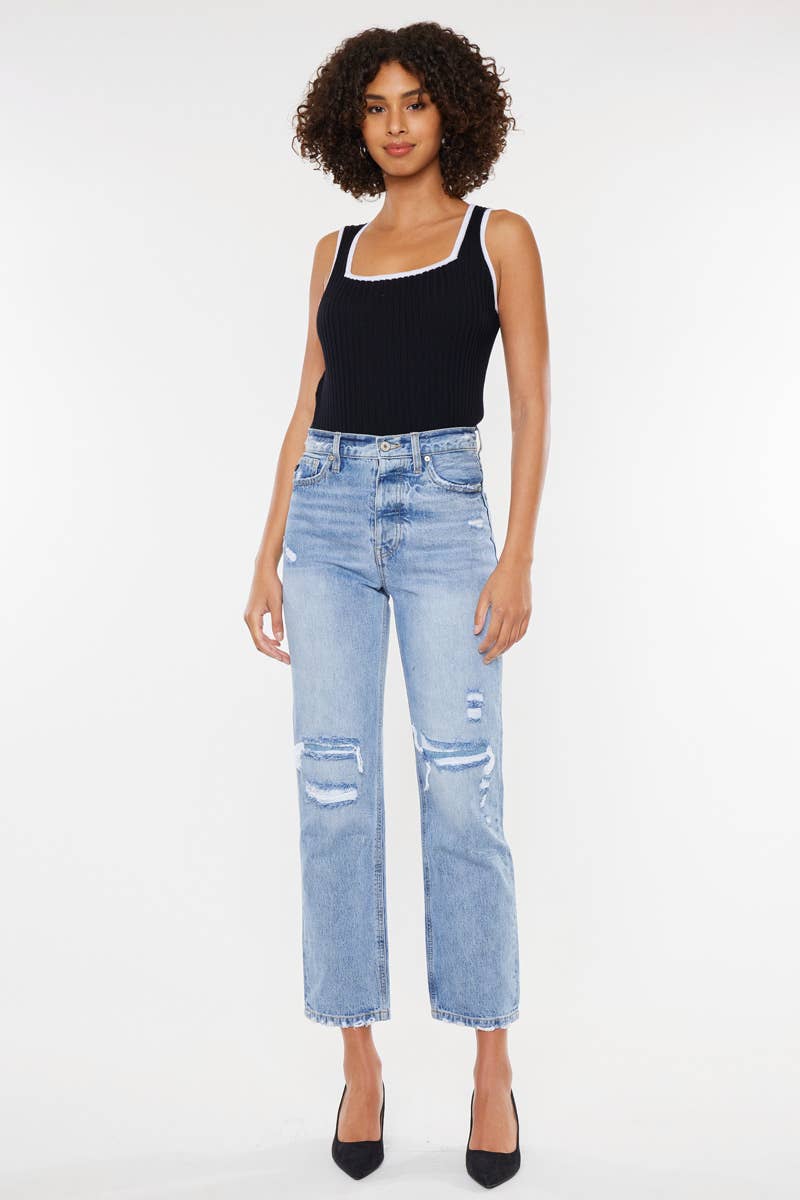 High Rise 90's Boyfriend Jeans, Relaxed light stone wash. Distressed fading and whiskering.