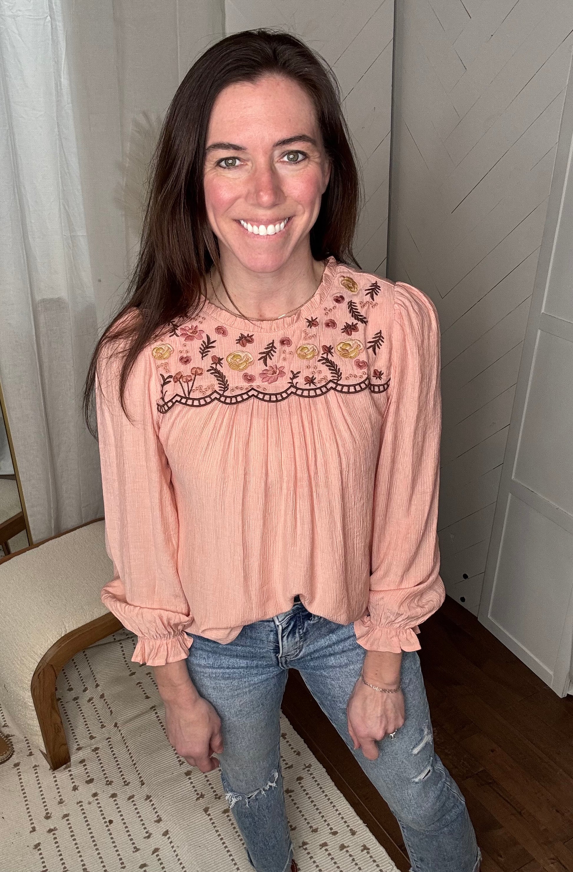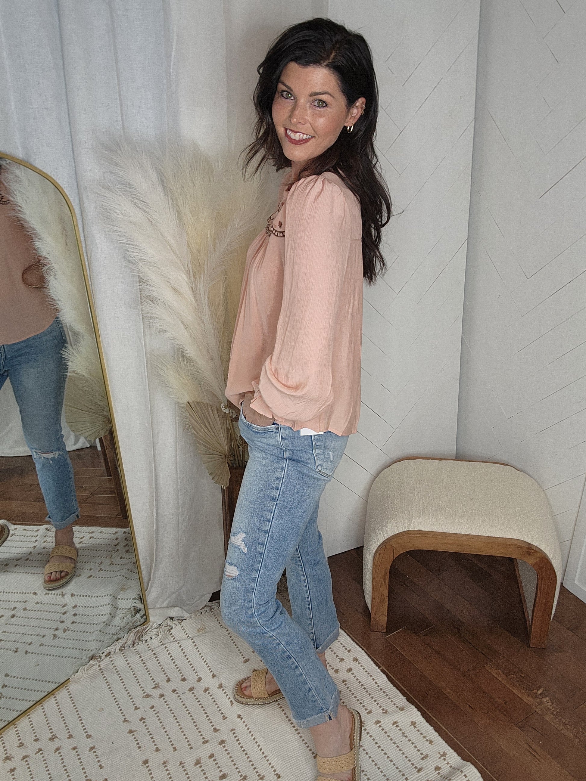 The textured fabric with a lightweight feel with a charming and feminine silhouette with the flounce sleeves, creating a graceful and whimsical look that is both stylish and flattering.