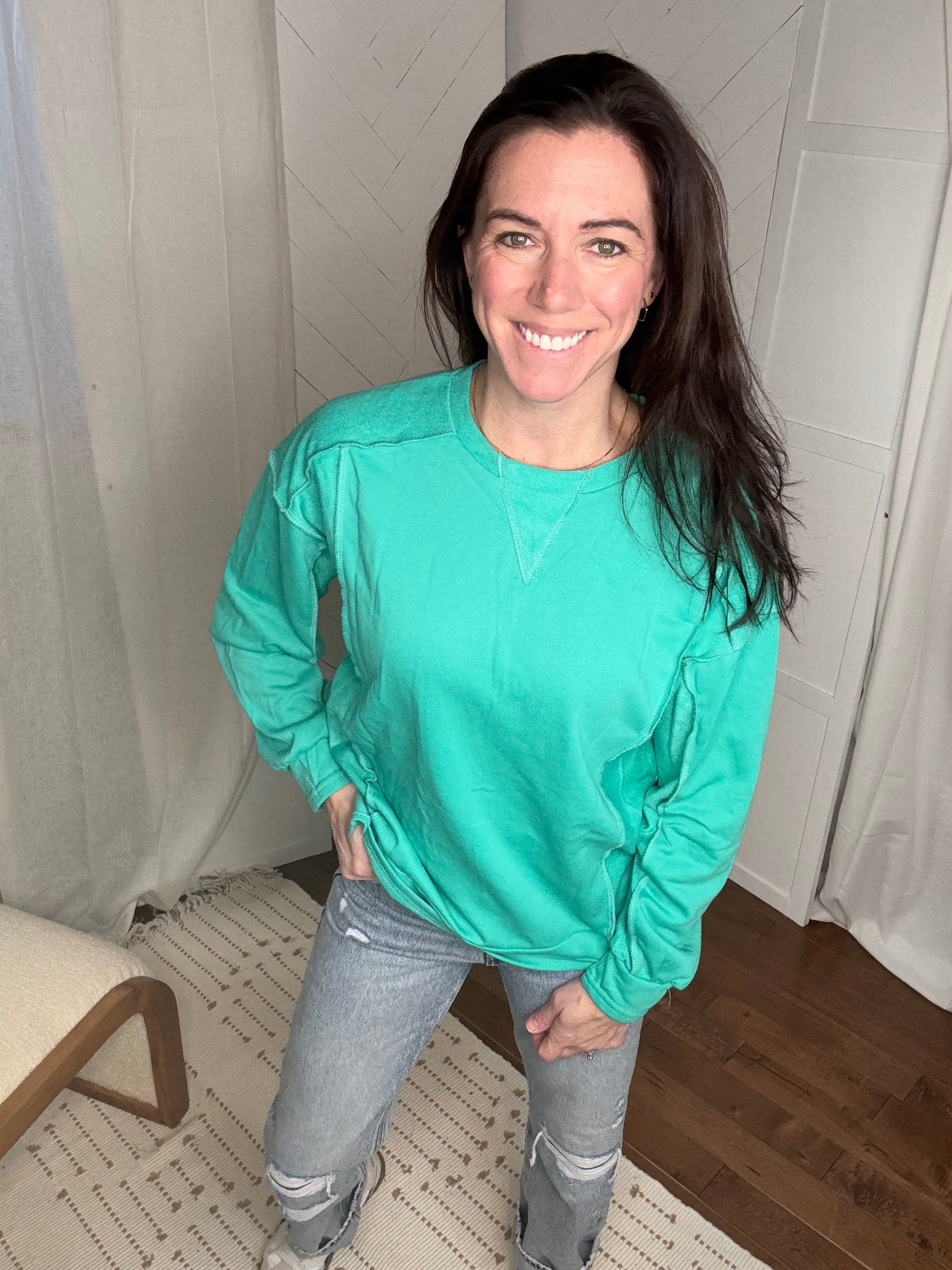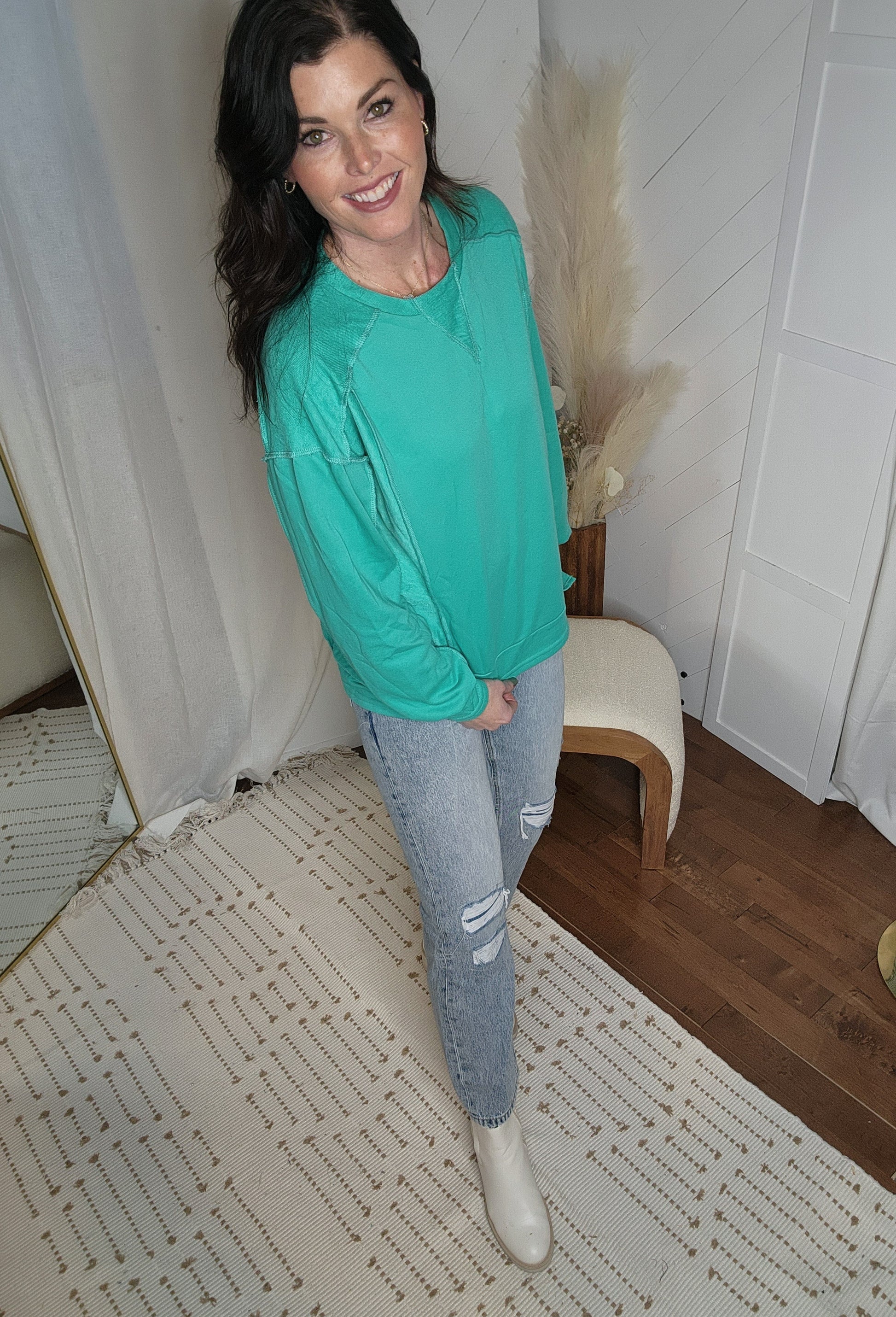 Timeless style: Round neck and relaxed fit create a classic silhouette with splicing details that add a flair to the solid-colored sweatshirt.