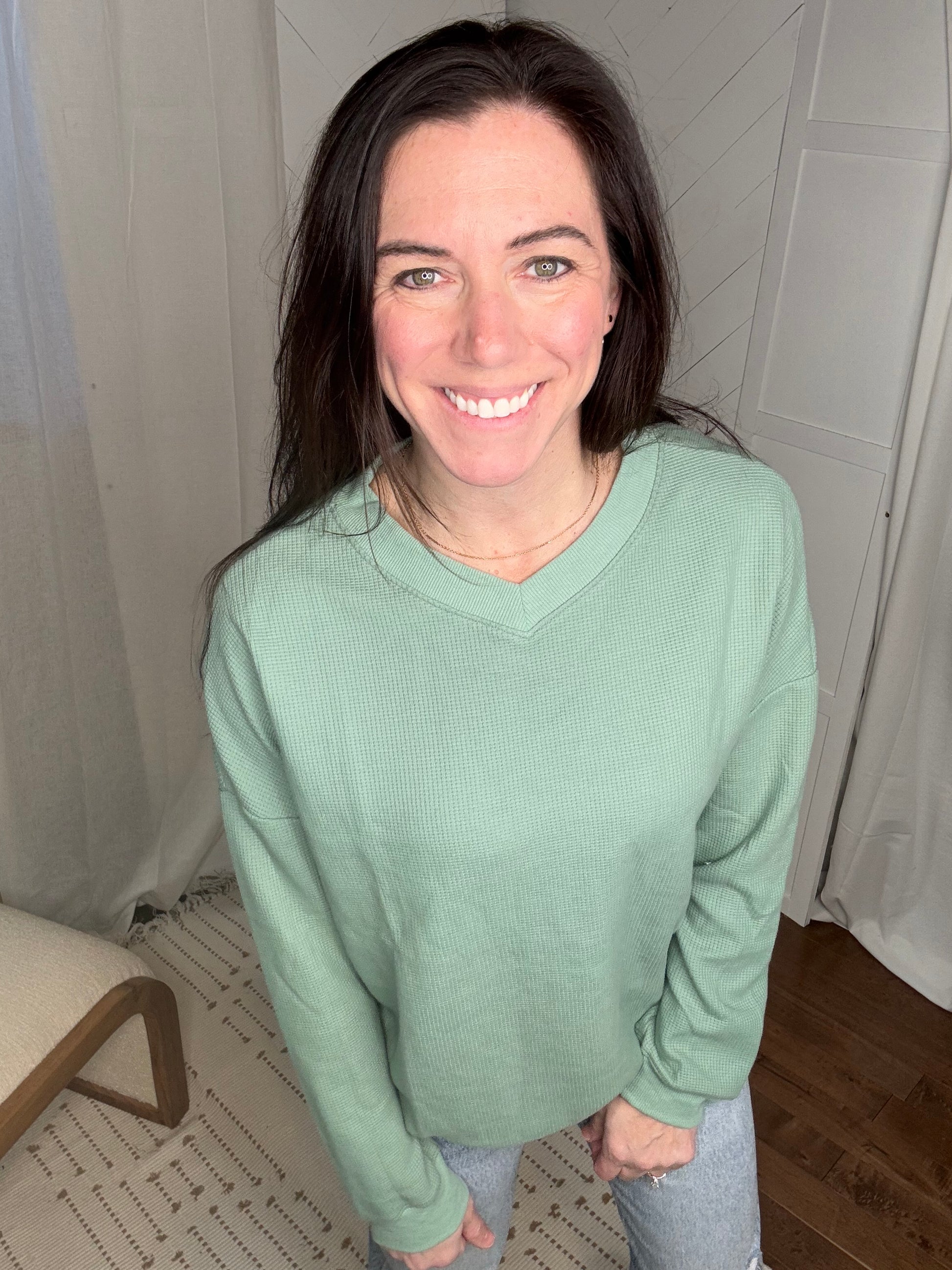 Waffle knit texture for warmth and chic V-neckline for femininity.