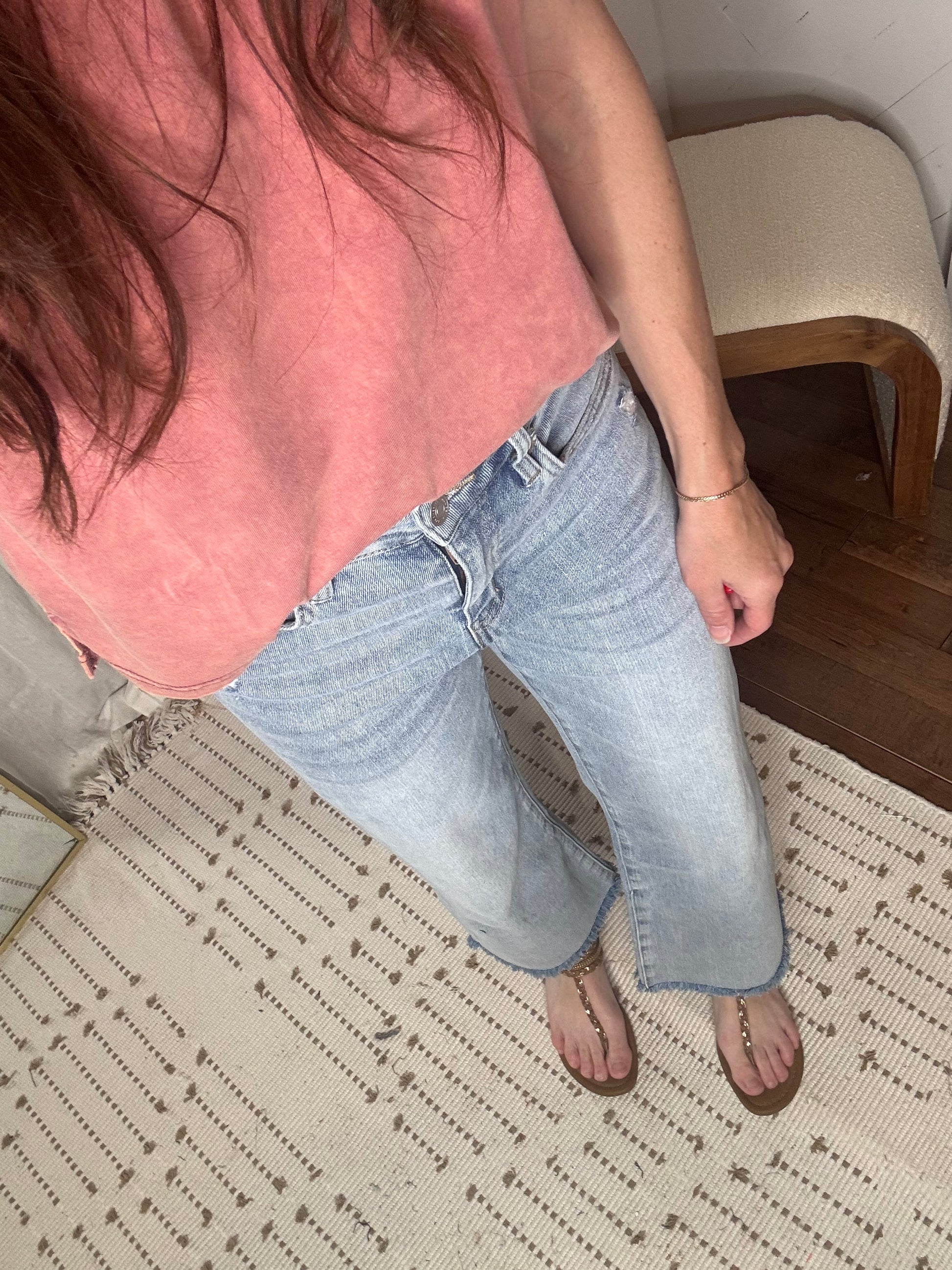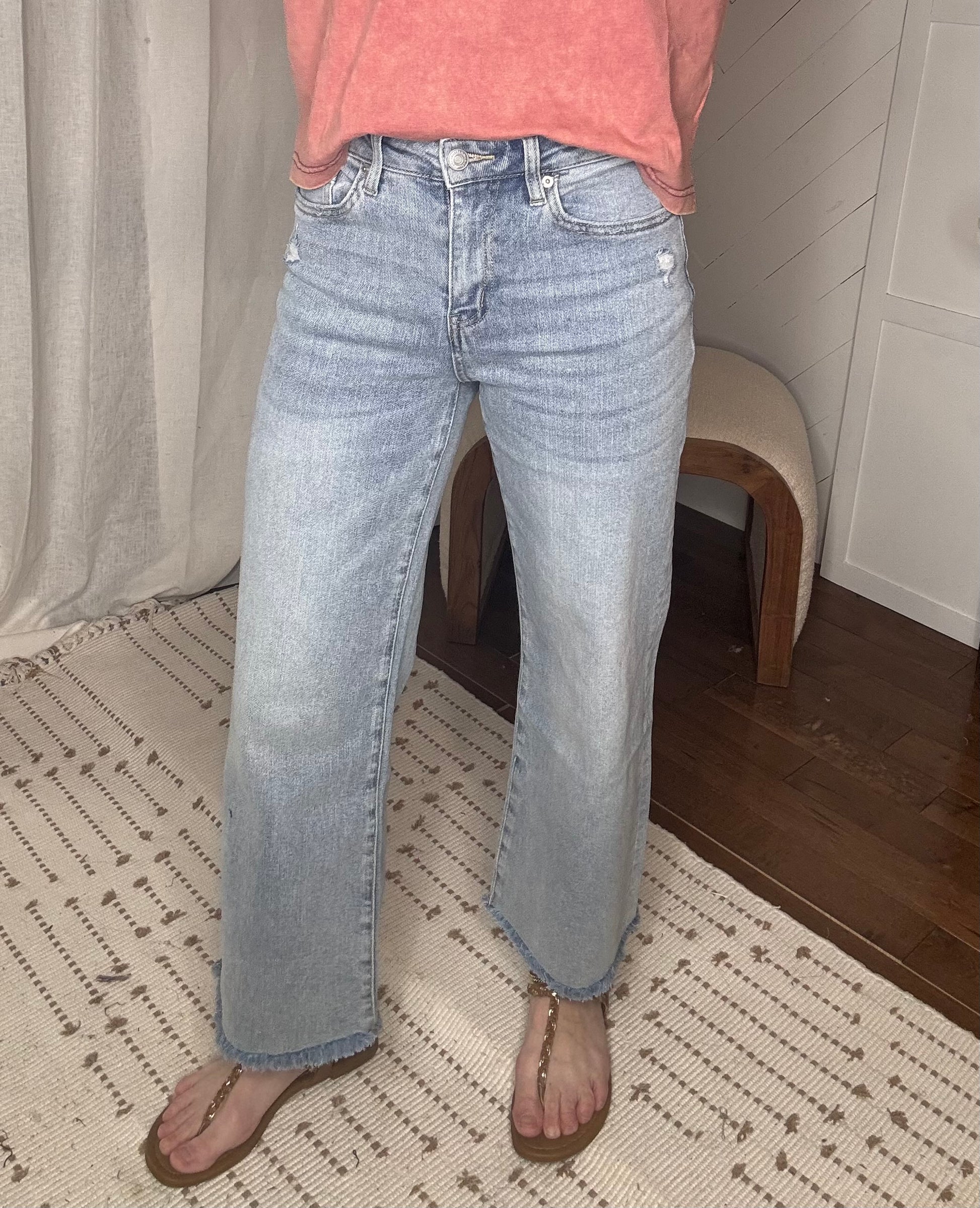 These high-rise wide-leg jeans are your new go-to for elevated everyday style. Designed with a flattering silhouette, soft comfort stretch, and a raw frayed hem for that perfectly lived-in feel. Dress them up with heels or keep it casual with sneakers—either way, they make a statement while keeping you comfortable all day long.