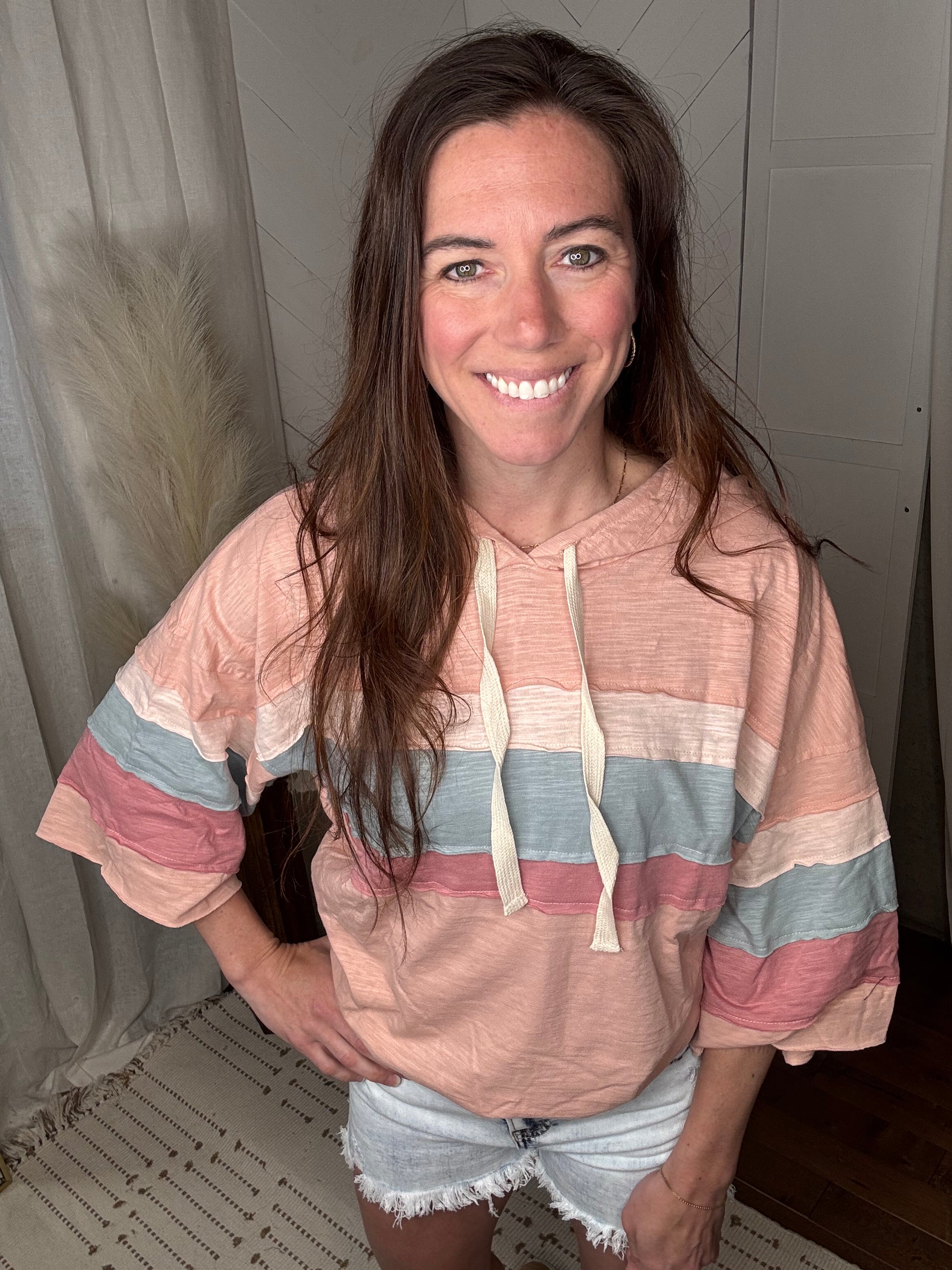 Soft, stylish, and effortlessly cool—this dusty peach color block hoodie features raw edge detailing for a laid-back vibe. The muted tones blend beautifully for a fresh, casual look. True to size with a comfy fit you’ll love all season long.