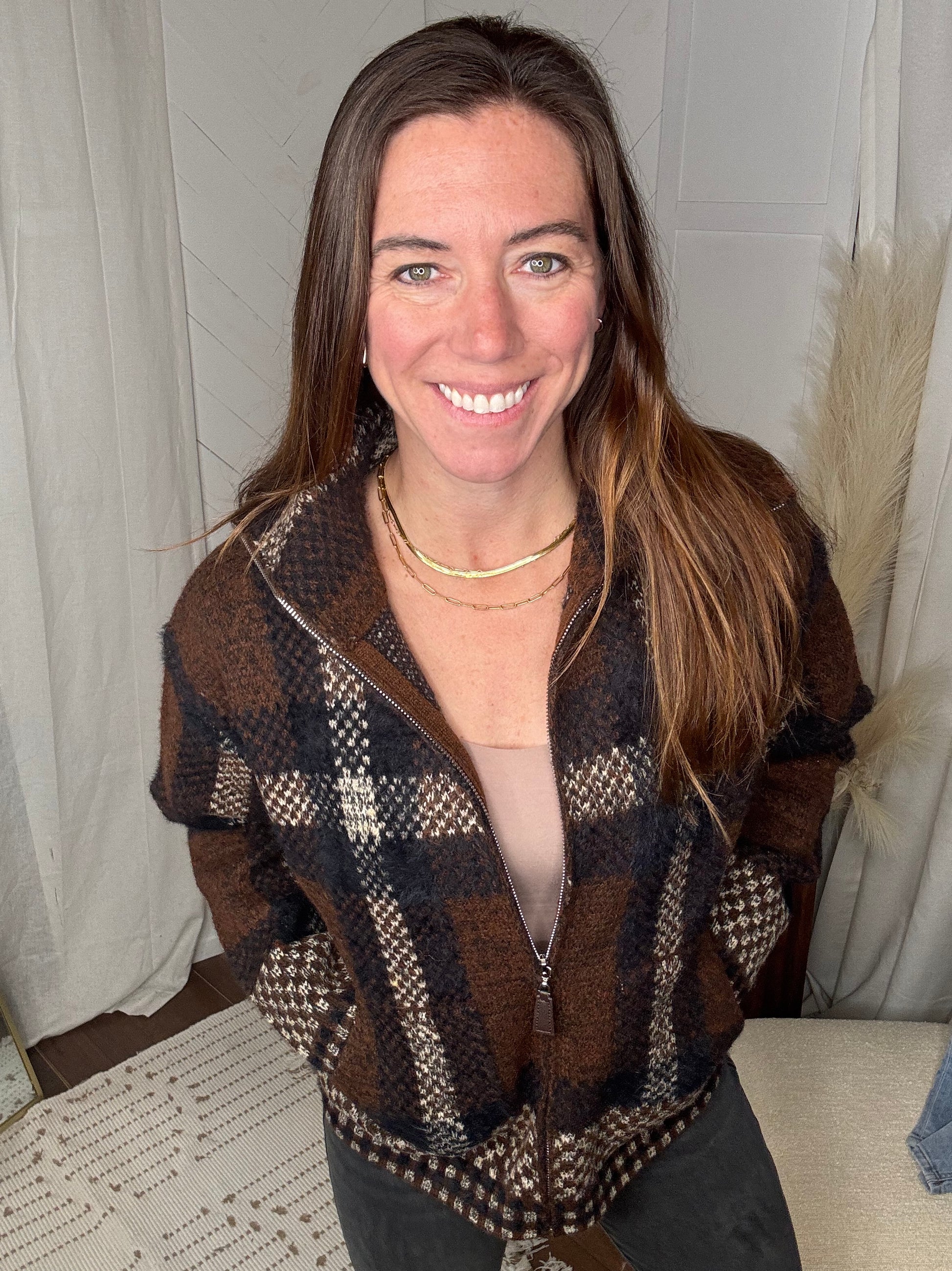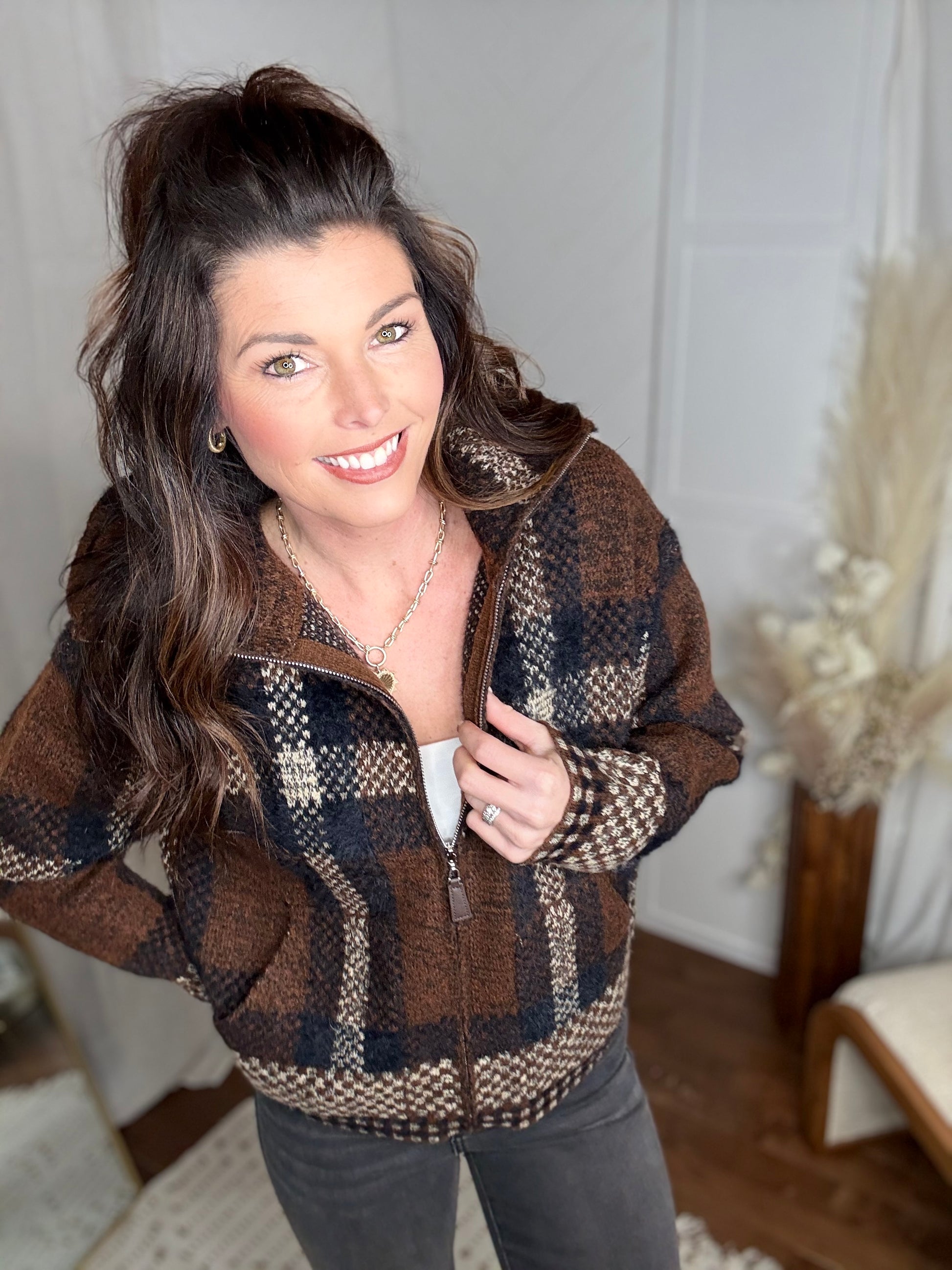 This stylish and cozy sweater-jacket is crafted from a richly textured, fuzzy knit, featuring a sophisticated plaid pattern in a rustic palette of deep brown, black, and cream. The intricate design combines both solid and checkered weaves, adding depth and visual interest. It's equipped with a versatile wide collar that can be zipped up for extra warmth, a full front zipper with a faux-leather pull, and practical side pockets.