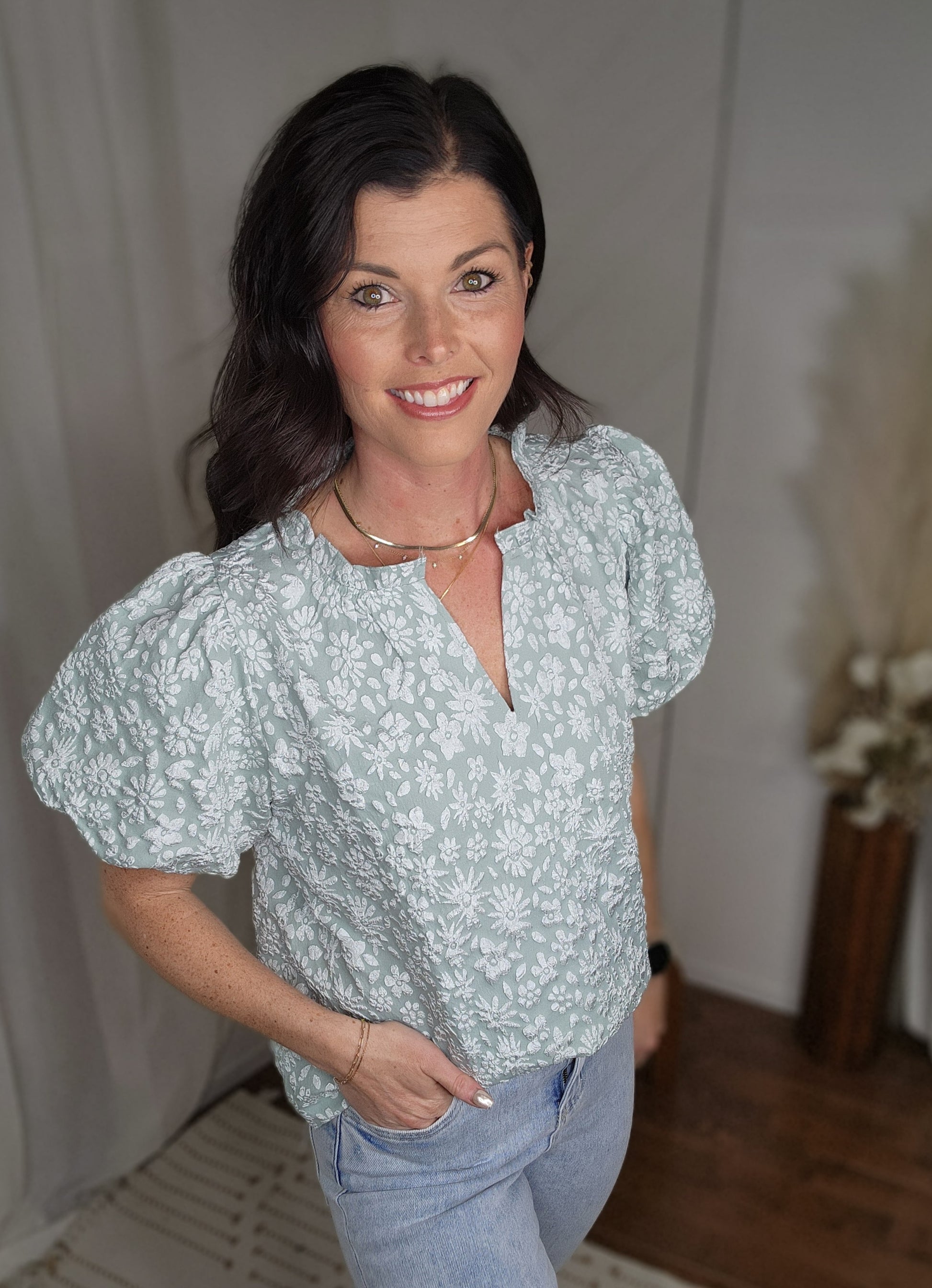 Floral Pattern texture short balloon sleeves ruffled v neck top