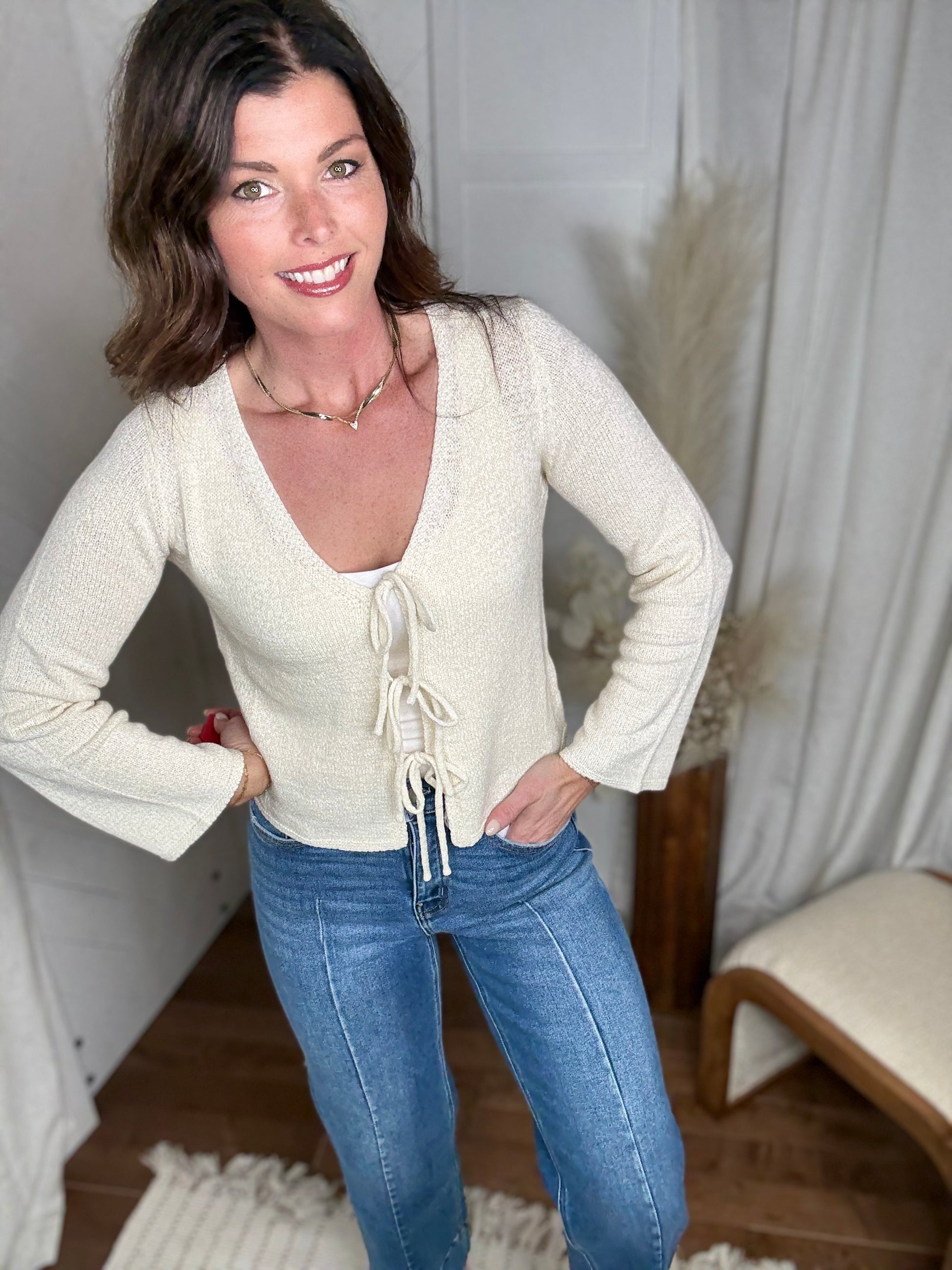 Lightweight and effortlessly chic, this long sleeve tan tie cardigan is the perfect layering piece. Its soft, breathable fabric and flattering front tie make it easy to style for any season — casual days or dressed-up nights alike.