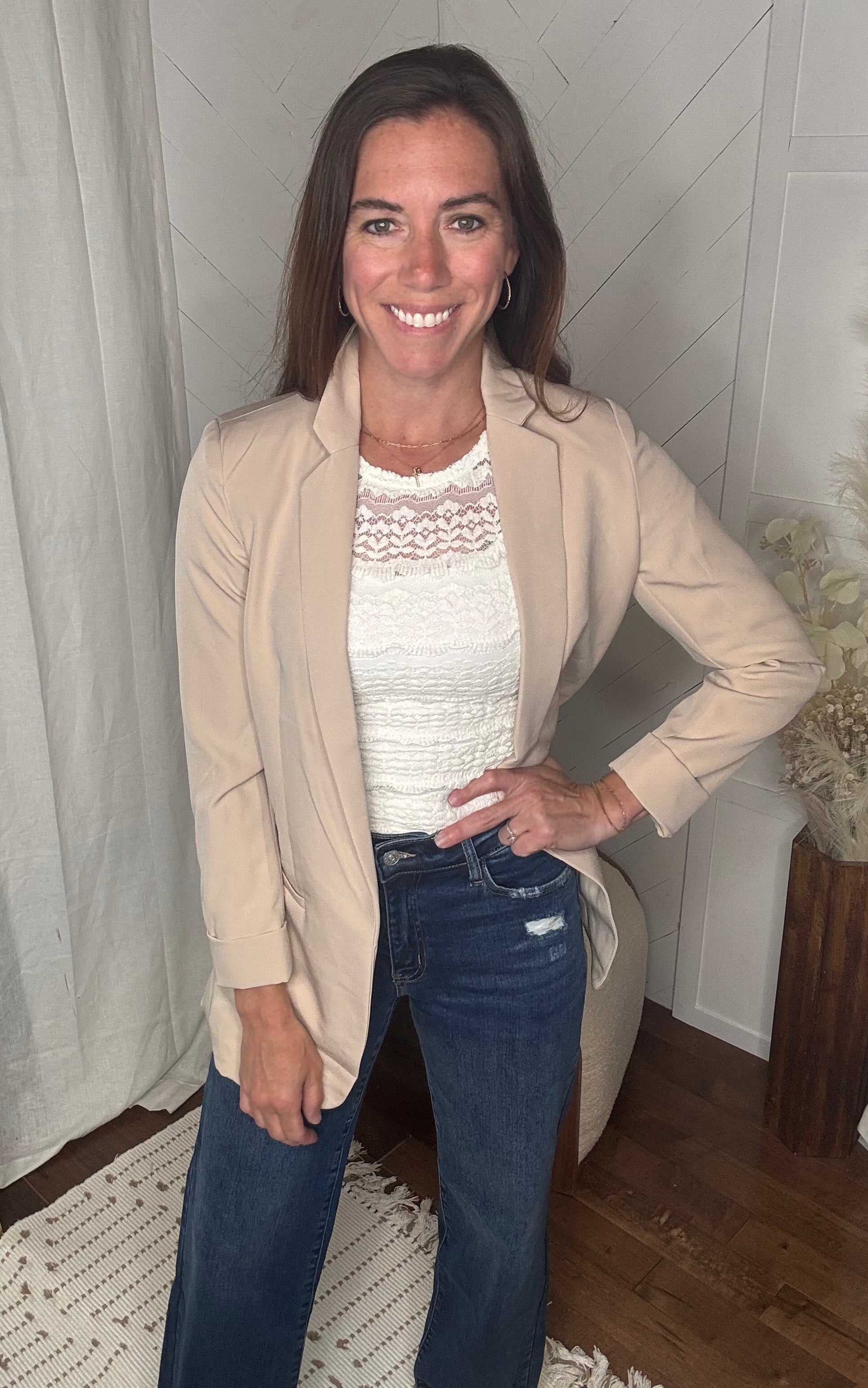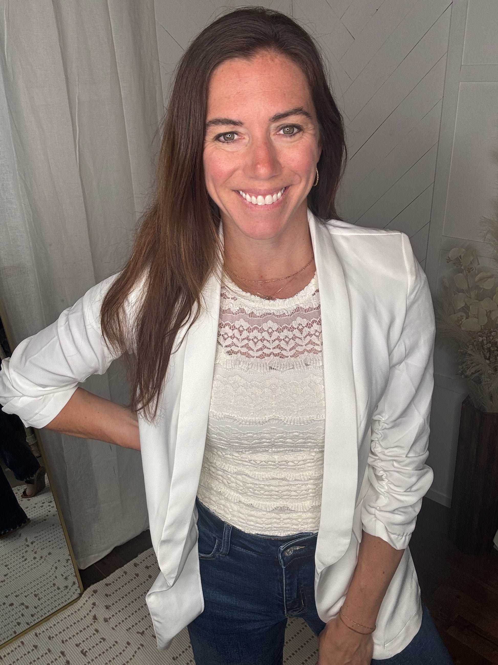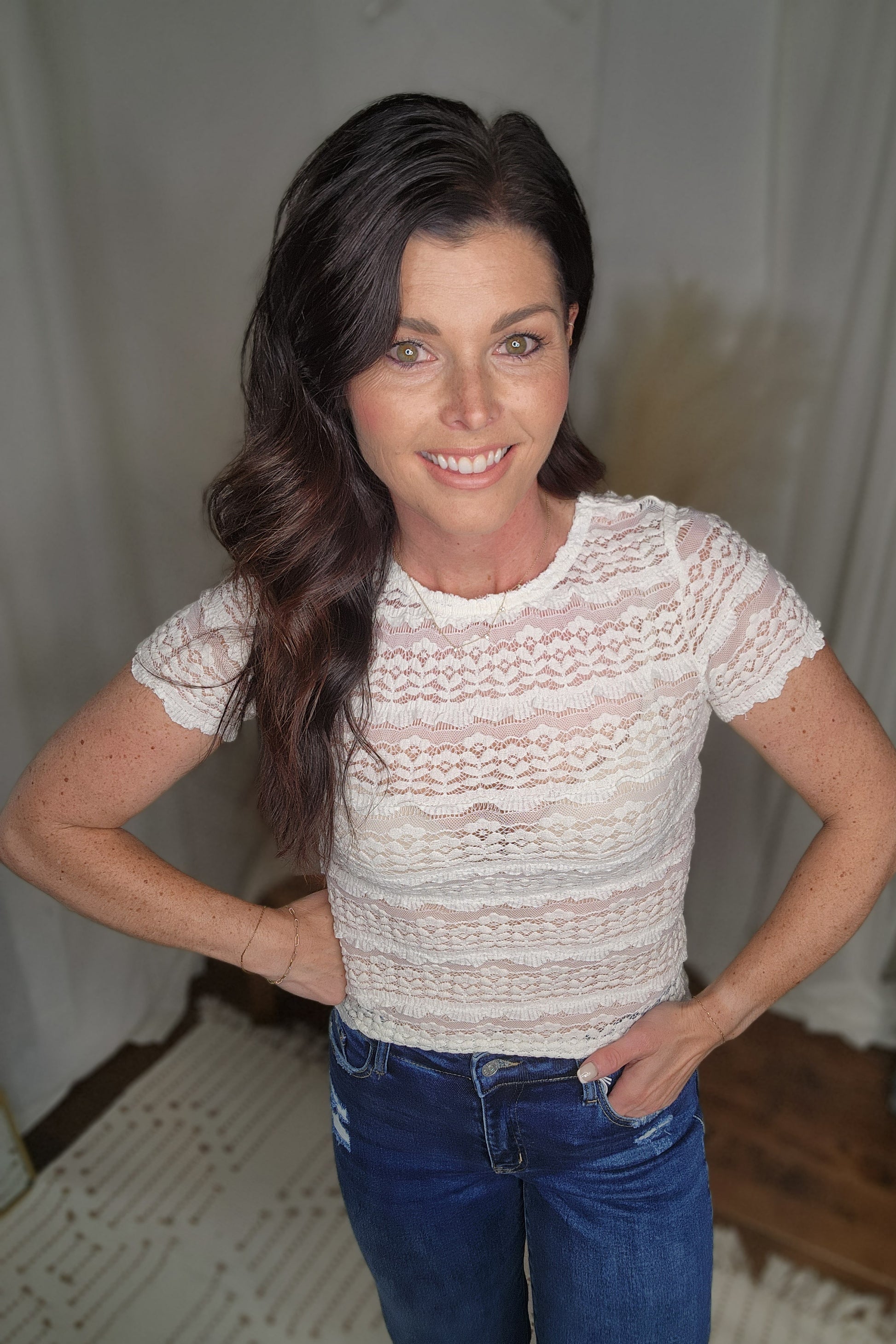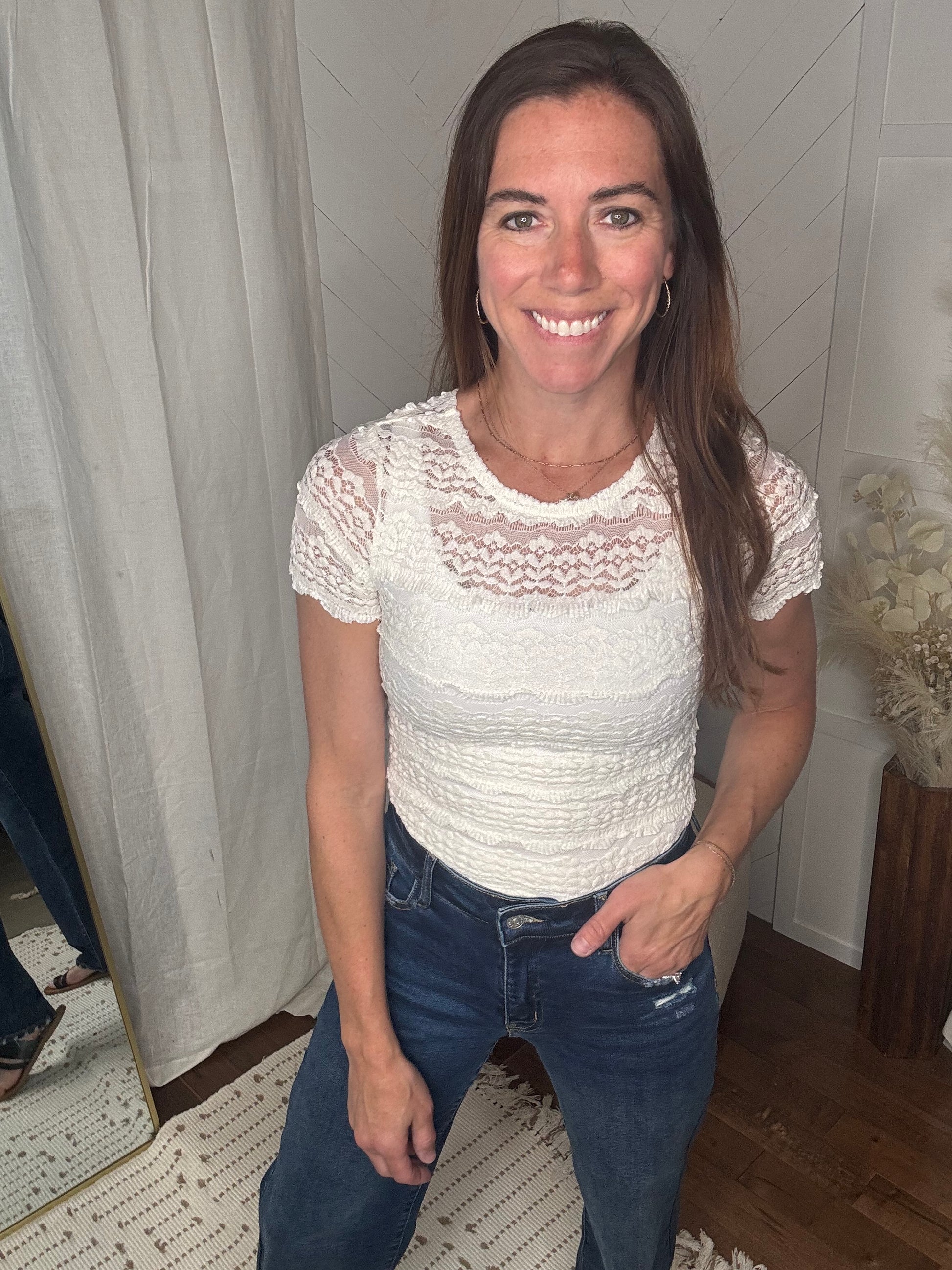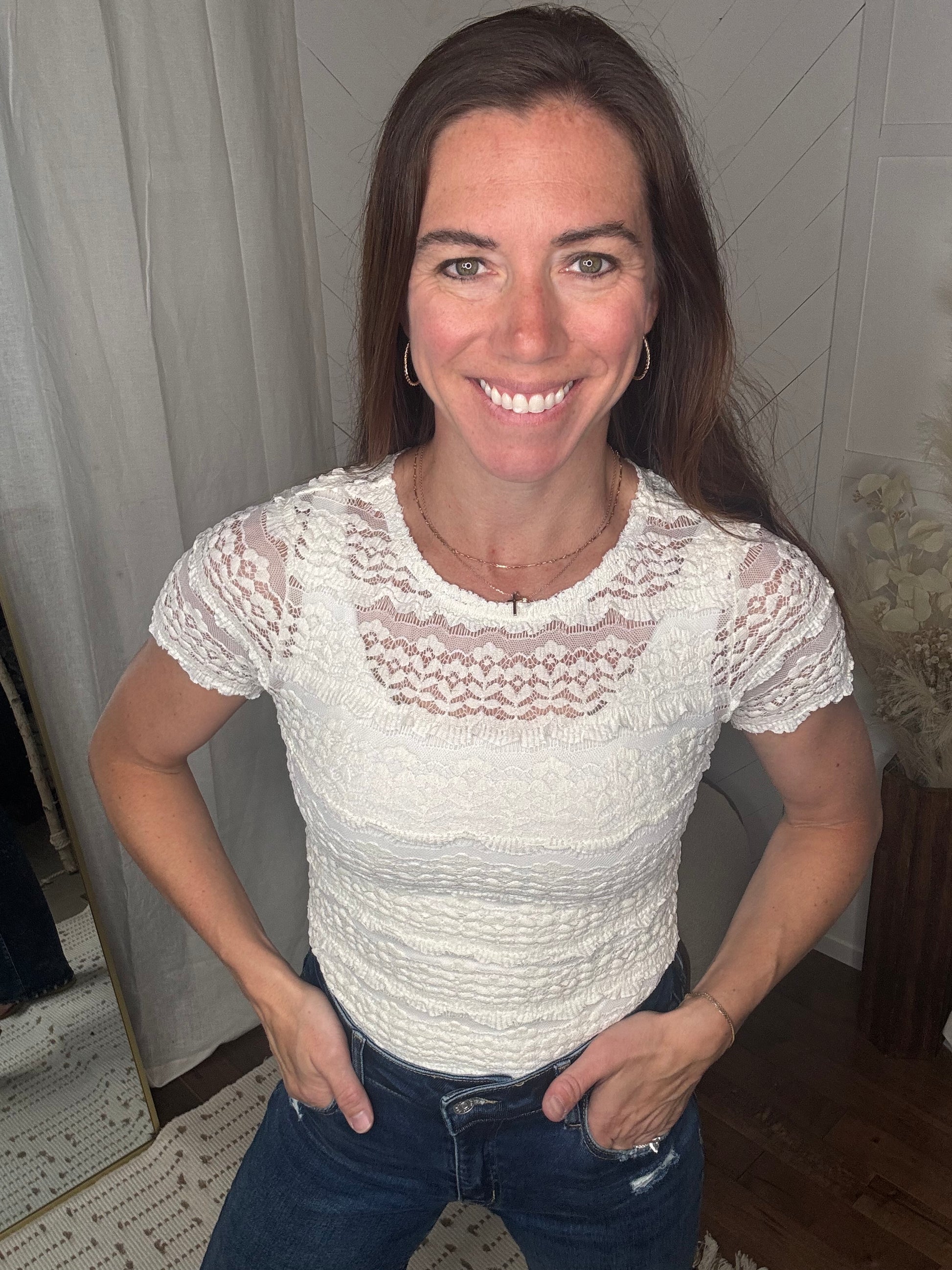 This is a short-sleeved, crew neck top in crafted entirely from lace fabric. Its distinctive feature is the construction using horizontal bands, significant texture and dimension. This alternating pattern repeats down the bodice and onto the short sleeves. The top has a fitted silhouette and appears semi-sheer due to the nature of the lace, especially in the non-ruffled sections.