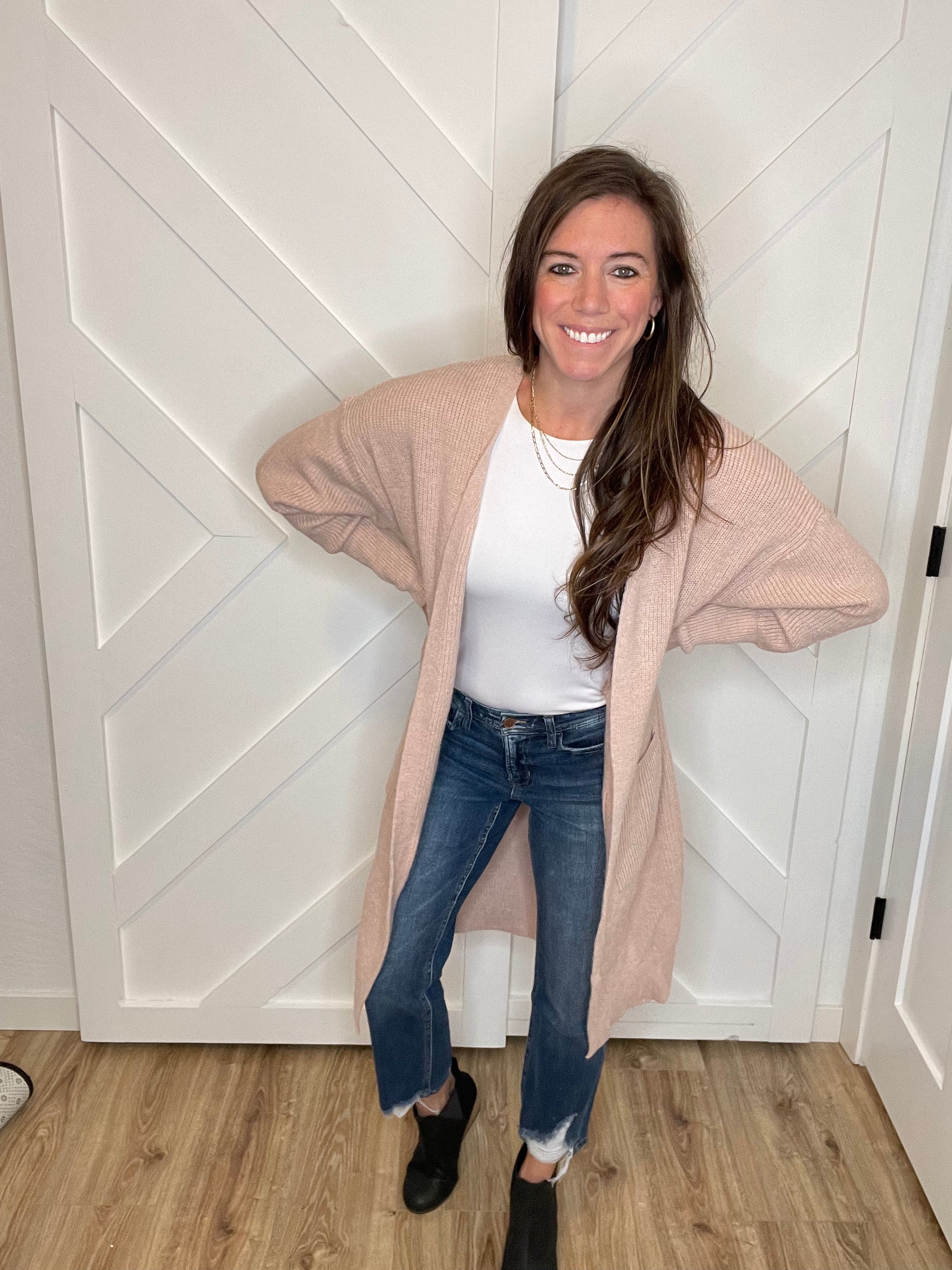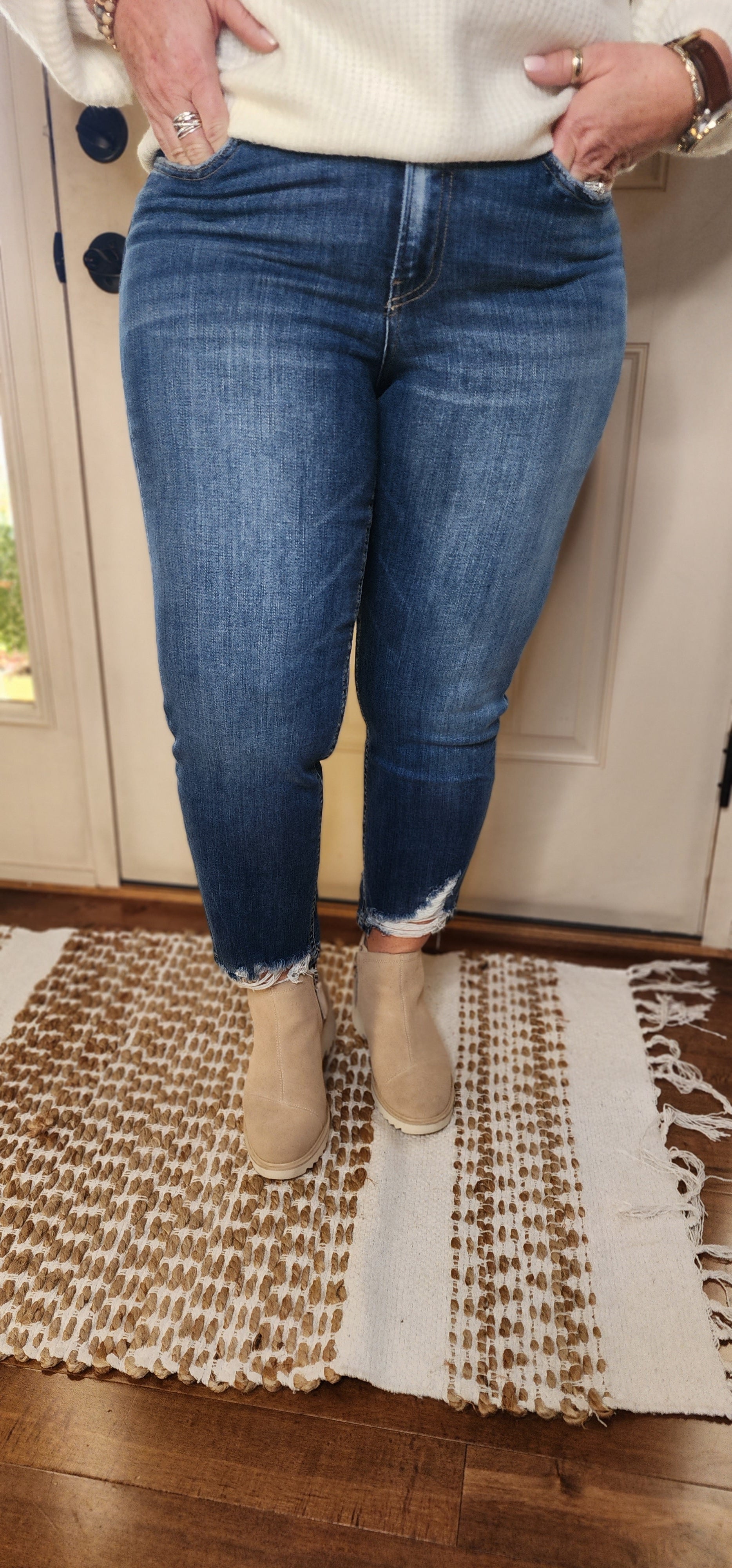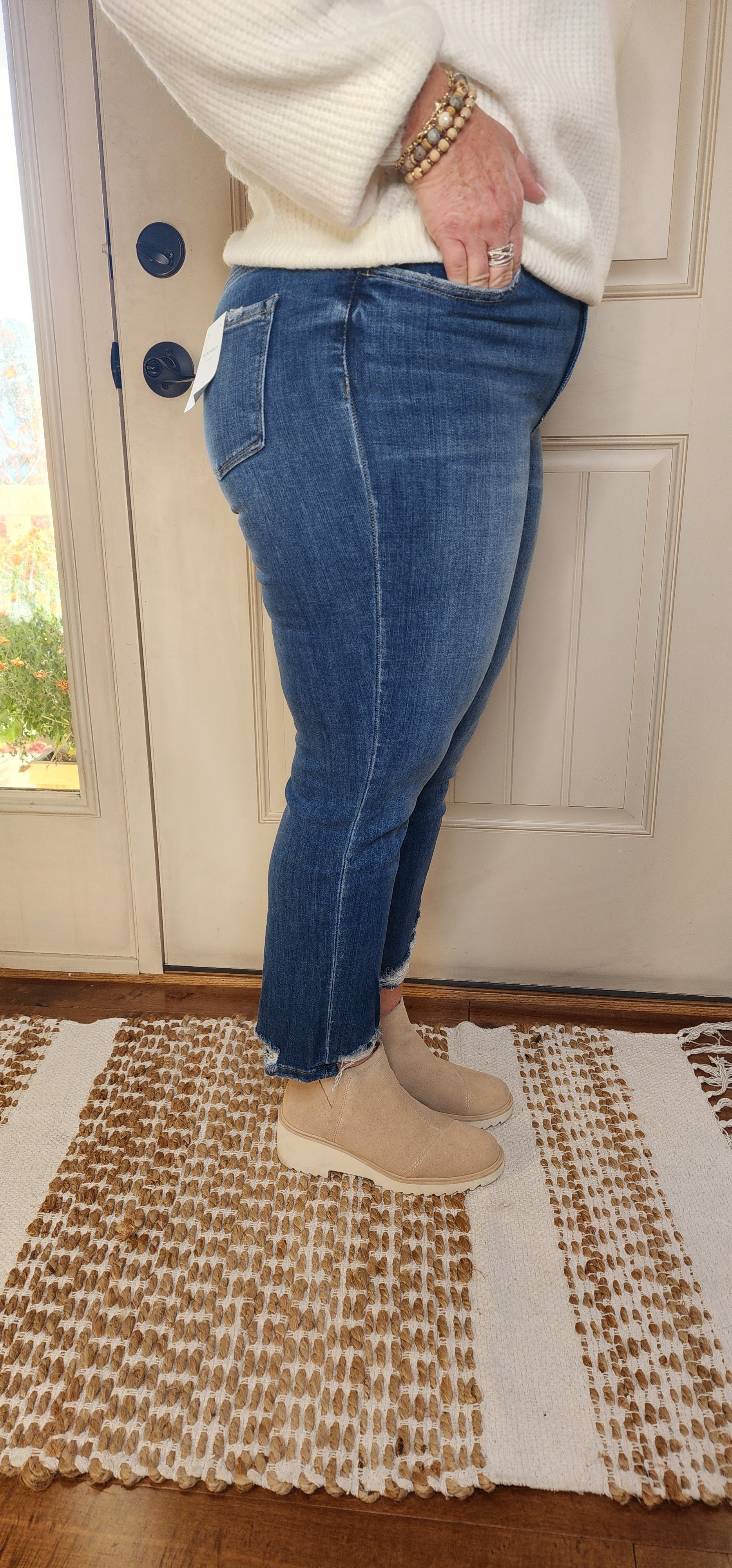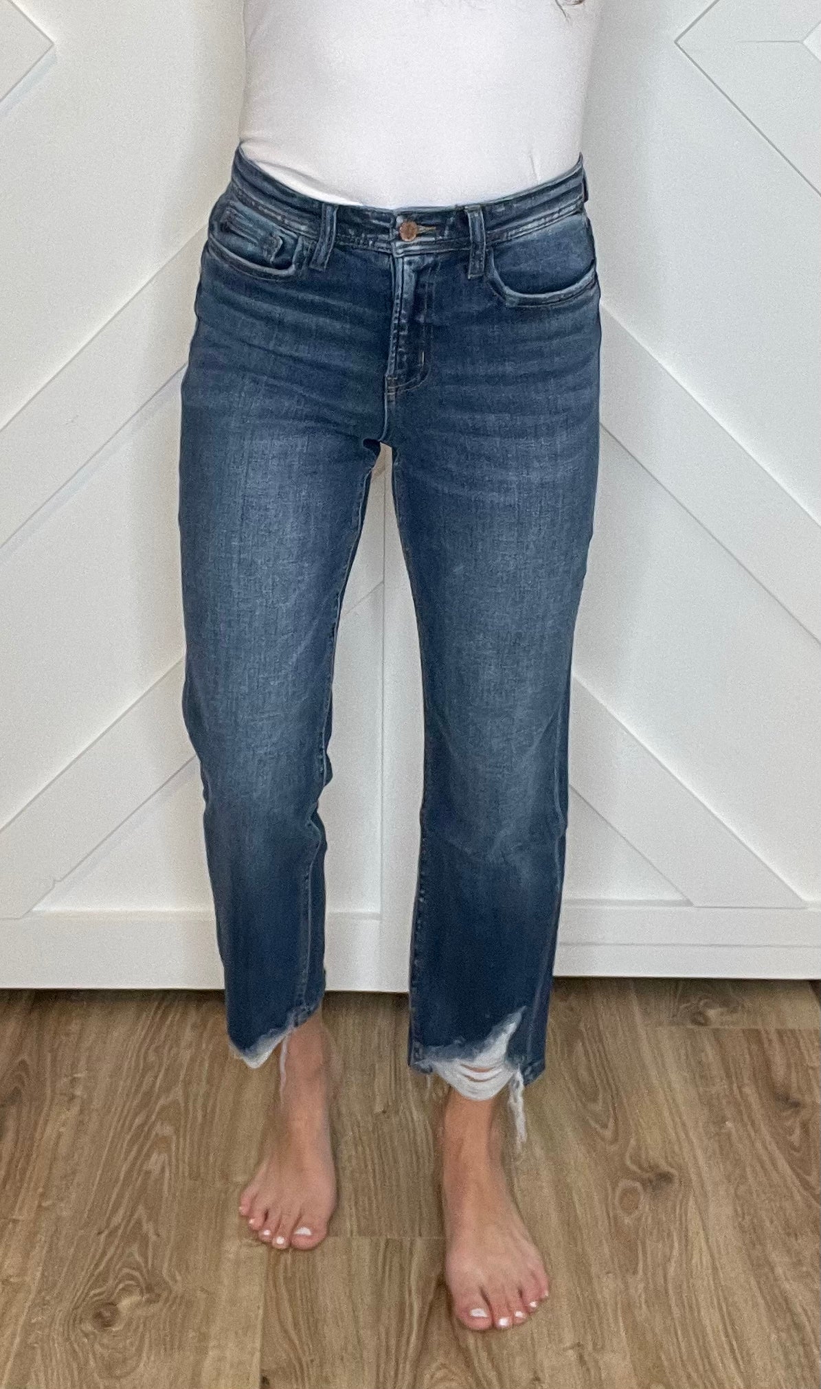 High rise, straight denim with a fun distressed hem. Comfort stretch and so cute!!