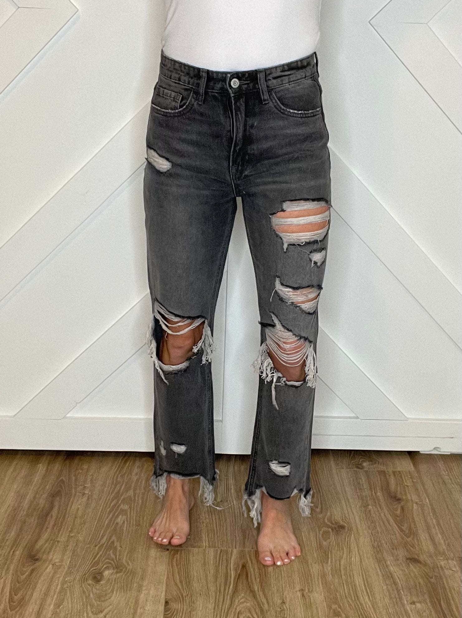 Non stretch denim, high rise waisted with tons of distressed detailing!!